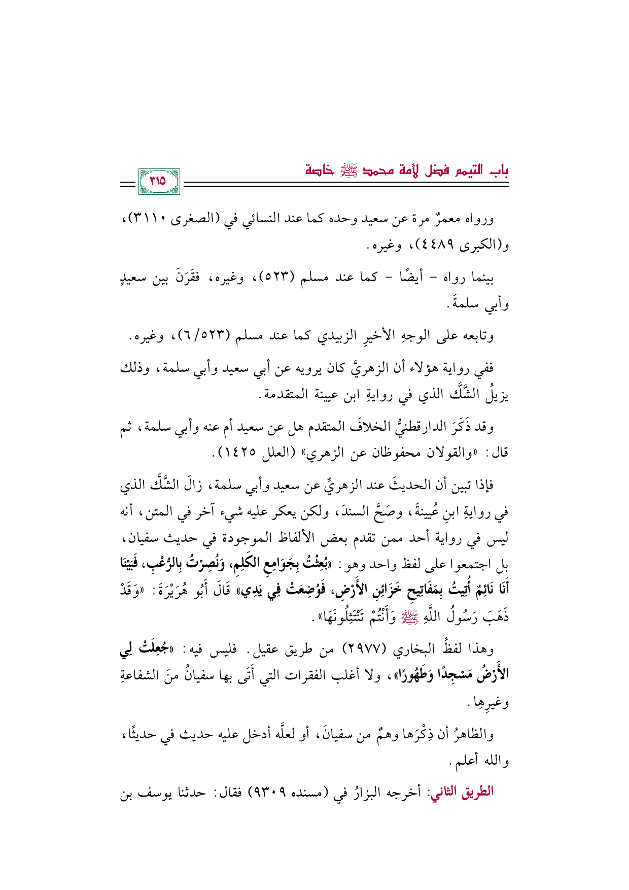 فإذا تبين أن الحديثَ عند الزهريِّ عن سعيد وأبي سلمة، زالَ الشَّكَّ الذي في روايةِ ابنِ عُيينةَ، وصَحَّ السندَ، ولكن يعكر عليه شيء آخر في المتن، أنه ليس في رواية أحد ممن تقدم بعض الألفاظ الموجودة في حديث سفيان، بل اجتمعوا على لفظ واحد وهو: ((بُعِثْتُ بِجَوَامِعِ الكَلِمِ، وَنُصِرْتُ بِالرُّعْبِ، فَبَيْنَا أَنَا نَائِمٌ أُتِيتُ بِمَفَاتِيحِ خَزَائِنِ الأَرْضِ، فَوُضِعَتْ فِي يَدِي)) قَالَ أَبُو هُرَيْرَةَ: ((وَقَدْ ذَهَبَ رَسُولُ اللَّهِ صلى الله عليه وسلم وَأَنْتُمْ تَنْتَثِلُونَهَا)).