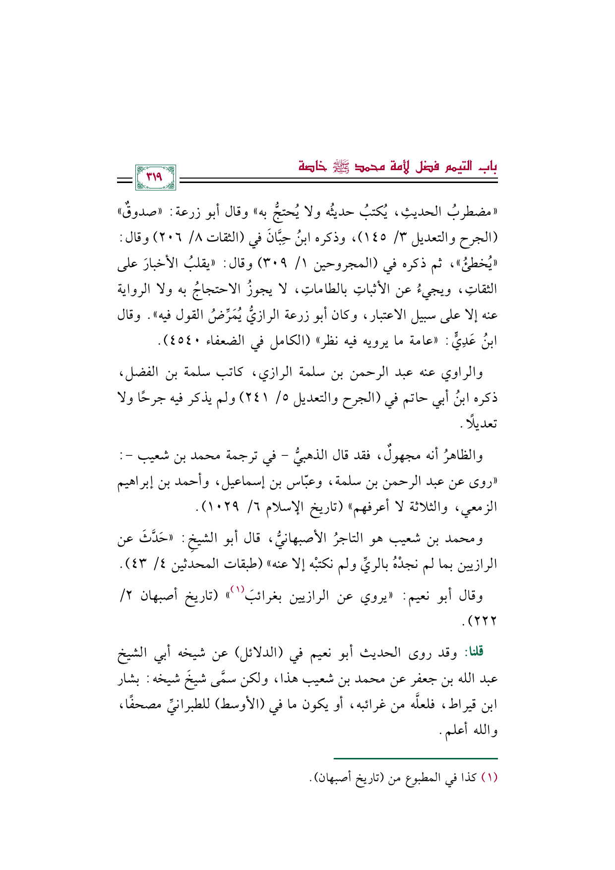 ومحمد بن شعيب هو التاجرُ الأصبهانيُّ، قال أبو الشيخِ: "حَدَّثَ عن الرازيين بما لم نجدْهُ بالريِّ ولم نكتبْه إلا عنه" (طبقات المحدثين ٤/ ٤٣).