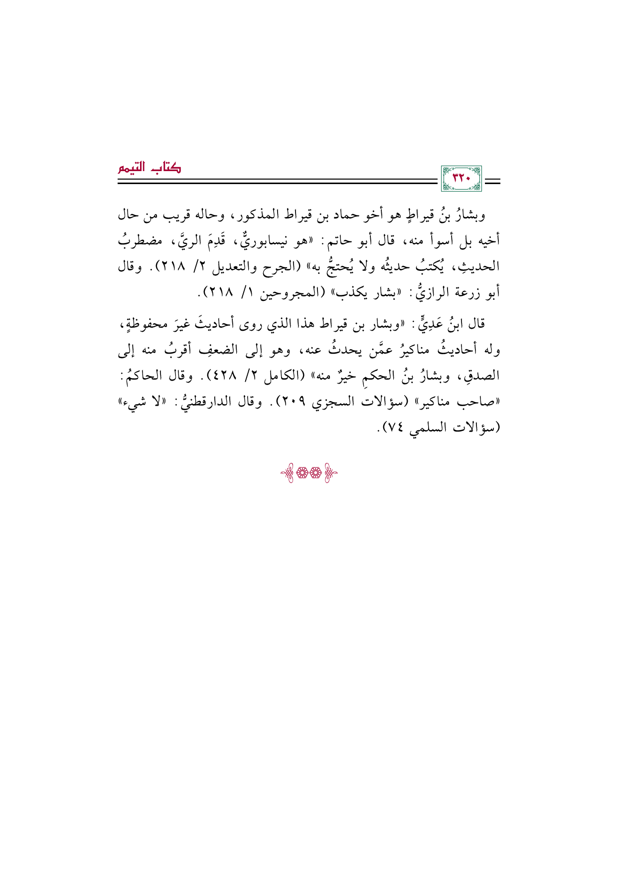 قال ابنُ عَدِيٍّ: "وبشار بن قيراط هذا الذي روى أحاديثَ غيرَ محفوظةٍ، وله أحاديثُ مناكيرُ عمَّن يحدثُ عنه، وهو إلى الضعفِ أقربُ منه إلى الصدقِ، وبشارُ بنُ الحكمِ خيرٌ منه" (الكامل ٢/ ٤٢٨). وقال الحاكمُ: "صاحب مناكير" (سؤالات السجزي ٢٠٩). وقال الدارقطنيُّ: "لا شيء" (سؤالات السلمي ٧٤).