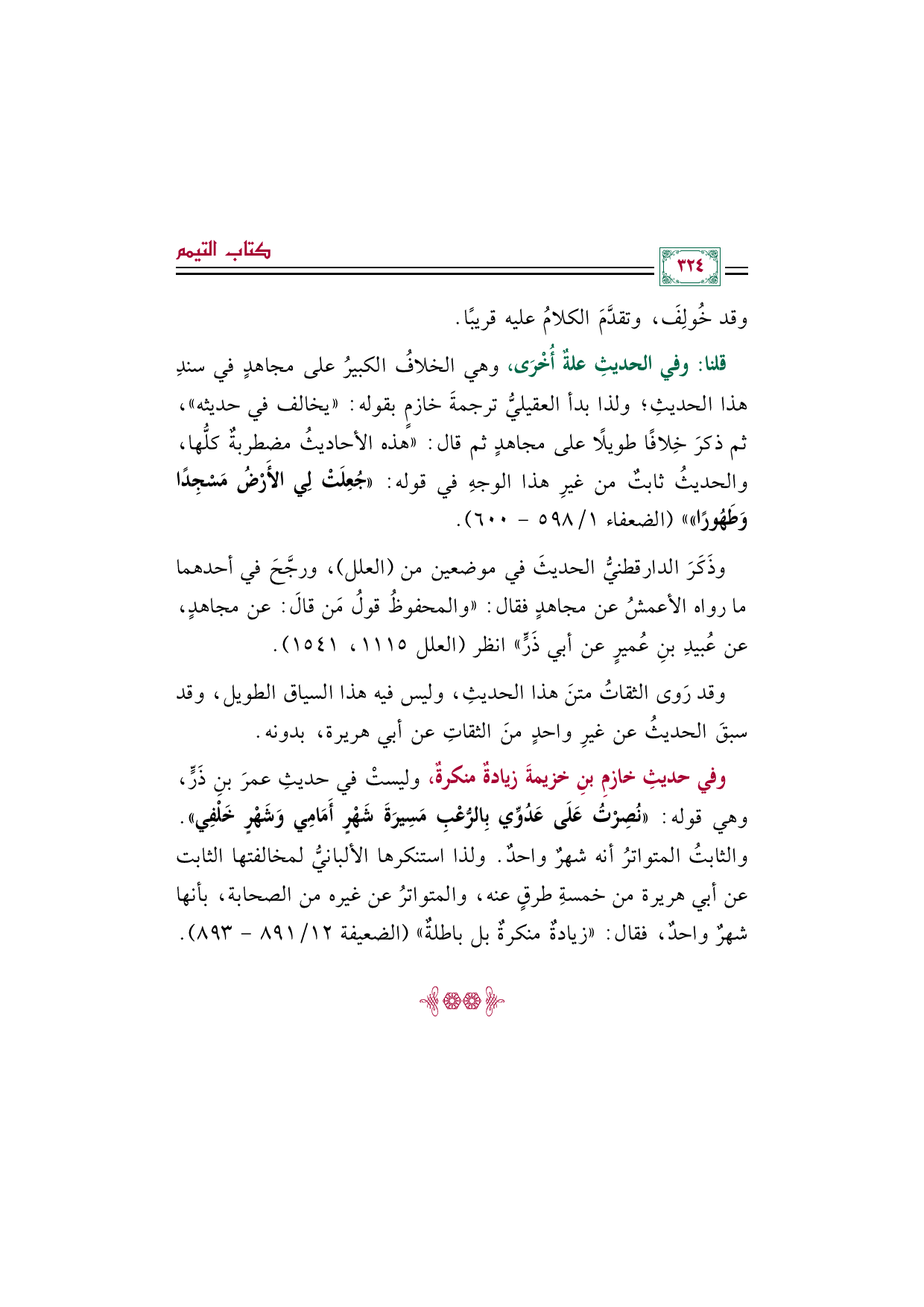 قلنا: وفي الحديثِ علةٌ أُخْرَى، وهي الخلافُ الكبيرُ على مجاهدٍ في سندِ هذا الحديثِ؛ ولذا بدأ العقيليُّ ترجمةَ خازمٍ بقوله: "يخالف في حديثه"، ثم ذكرَ خِلافًا طويلًا على مجاهدٍ ثم قال: "هذه الأحاديثُ مضطربةٌ كلُّها، والحديثُ ثابتٌ من غيرِ هذا الوجهِ في قوله: ((جُعِلَتْ لِي الأَرْضُ مَسْجِدًا وَطَهُورًا)) " (الضعفاء ١/ ٥٩٨ - ٦٠٠).