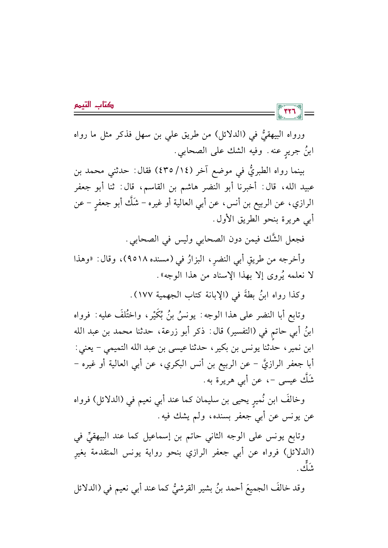 بينما رواه الطبريُّ في موضع آخر (١٤/ ٤٣٥) فقال: حدثني محمد بن عبيد الله، قال: أخبرنا أبو النضر هاشم بن القاسم، قال: ثنا أبو جعفر الرازي، عن الربيع بن أنس، عن أبي العالية أو غيره -شَكَّ أبو جعفرٍ- عن أبي هريرة بنحو الطريق الأول.