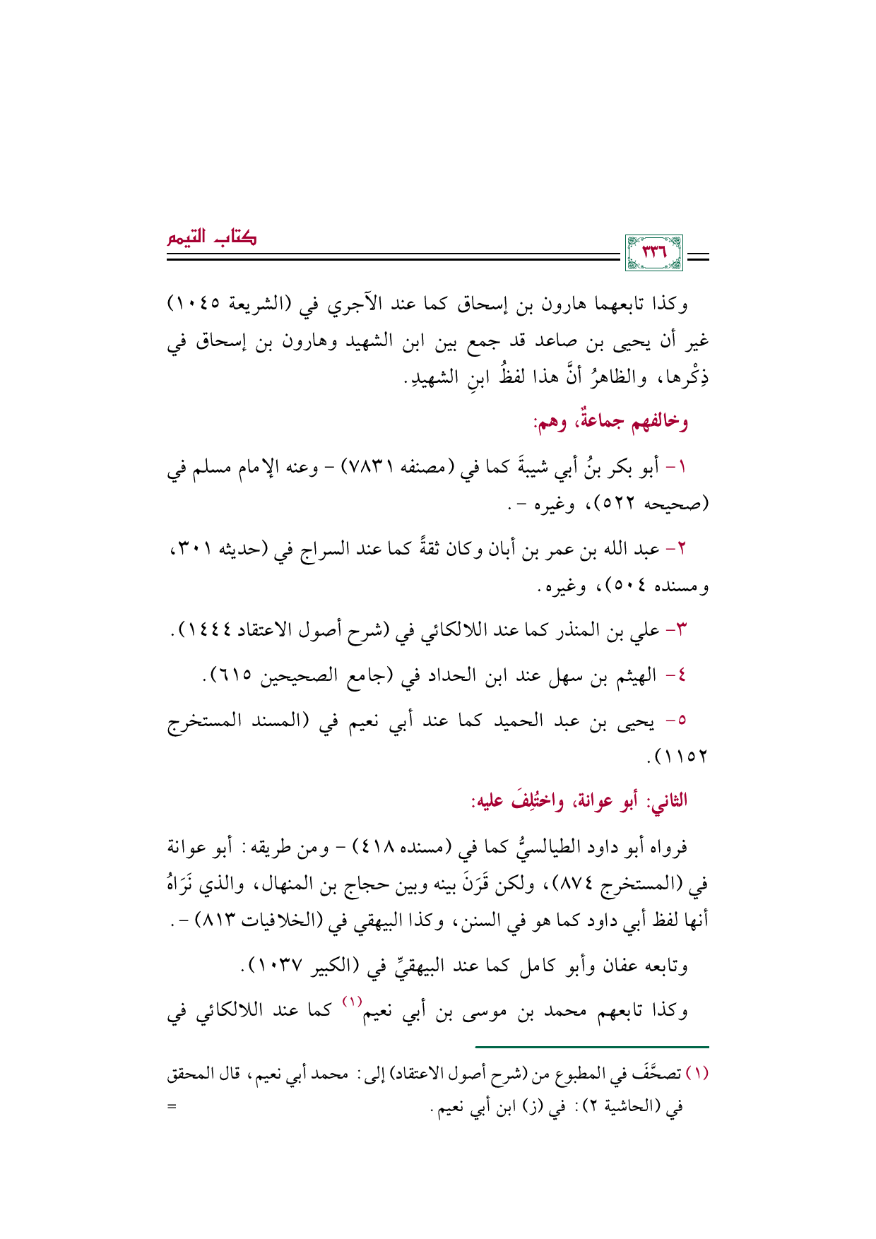 وكذا تابعهما هارون بن إسحاق كما عند الآجري في (الشريعة ١٠٤٥) غير أن يحيى بن صاعد قد جمع بين ابن الشهيد وهارون بن إسحاق في ذِكْرها، والظاهرُ أنَّ هذا لفظُ ابنِ الشهيدِ.