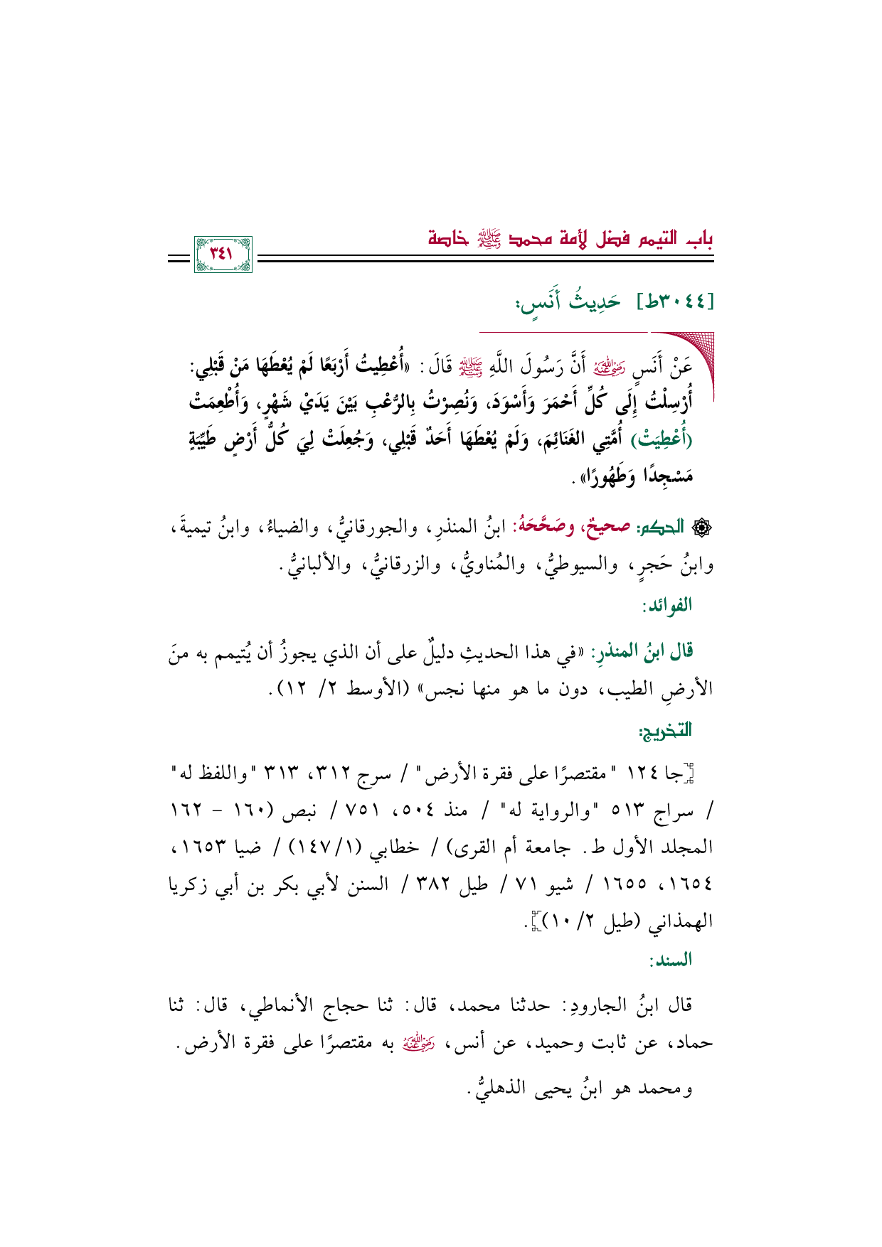 قال ابنُ الجارودِ: حدثنا محمد، قال: ثنا حجاج الأنماطي، قال: ثنا حماد، عن ثابت وحميد، عن أنس، رضي الله عنه به مقتصرًا على فقرة الأرض.