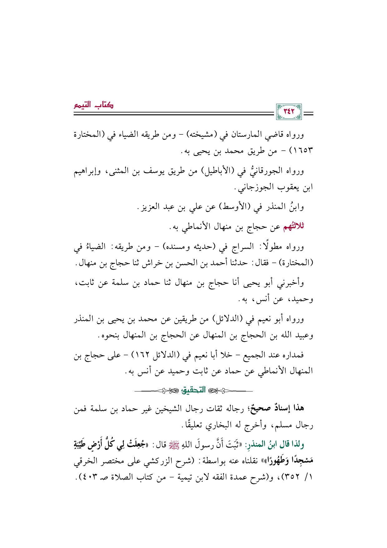 ولذا قال ابنُ المنذرِ: "ثَبَتَ أَنَّ رسولَ اللهِ صلى اللَّه عليه وسلم قال: ((جُعِلَتْ لِي كُلُّ أَرْضٍ طَيِّبَةٍ مَسْجِدًا وَطَهُورًا)) " نقلناه عنه بواسطة: (شرح الزركشي على مختصر الخرقي ١/ ٣٥٢)، و (شرح عمدة الفقه لابن تيمية - من كتاب الصلاة صـ ٤٠٣).