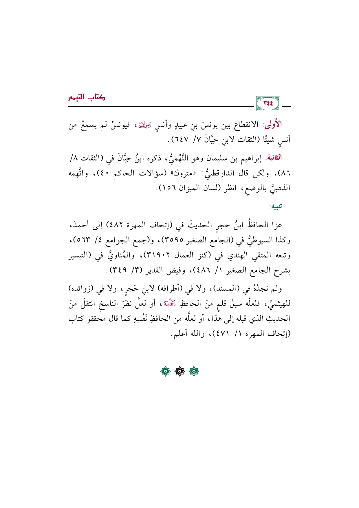 الثانية: إبراهيم بن سليمان وهو النَّهْميُّ، ذكره ابنُ حِبَّانَ في (الثقات ٨/ ٨٦)، ولكن قال الدارقطنيُّ: "متروك" (سؤالات الحاكم ٤٠)، واتَّهمه الذهبيُّ بالوضعِ، انظر (لسان الميزان ١٥٦).