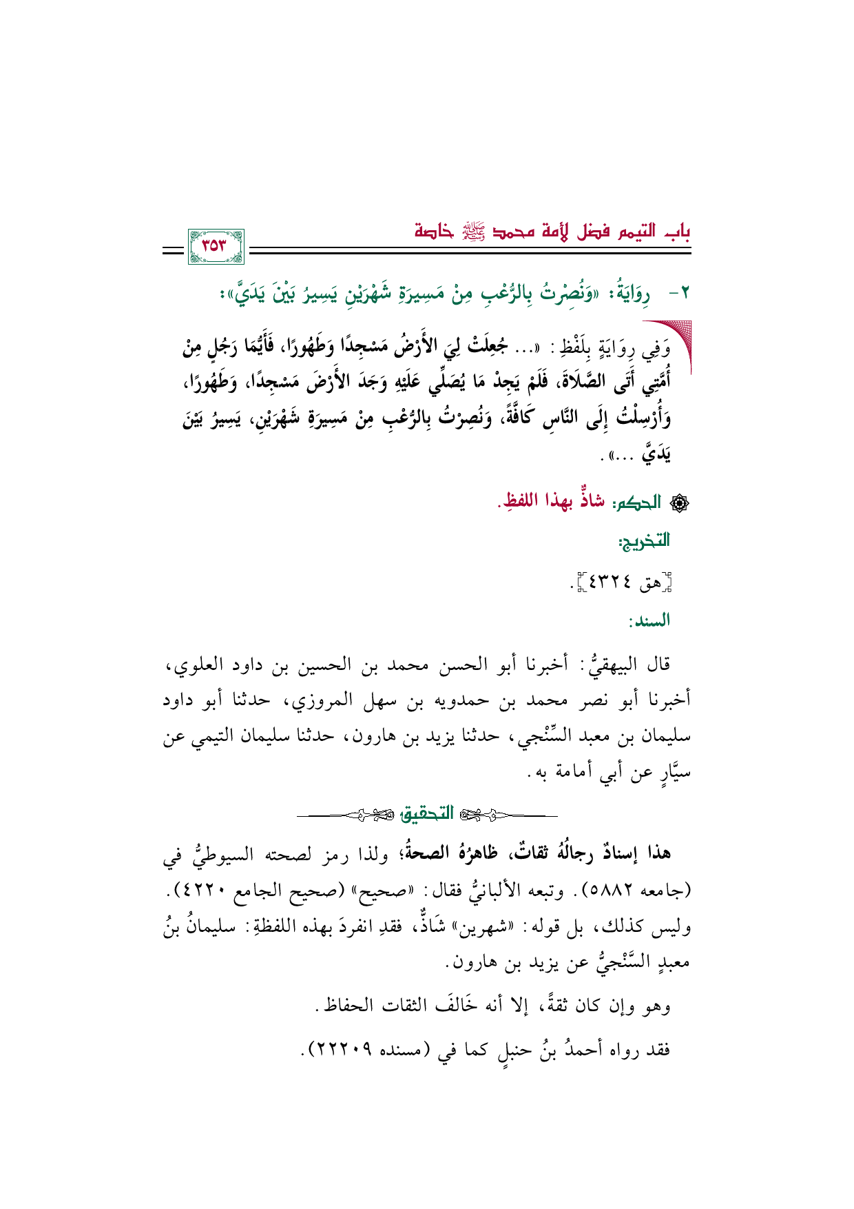قال البيهقيُّ: أخبرنا أبو الحسن محمد بن الحسين بن داود العلوي، أخبرنا أبو نصر محمد بن حمدويه بن سهل المروزي، حدثنا أبو داود سليمان بن معبد السِّنْجي، حدثنا يزيد بن هارون، حدثنا سليمان التيمي عن سيَّارٍ عن أبي أمامة به.