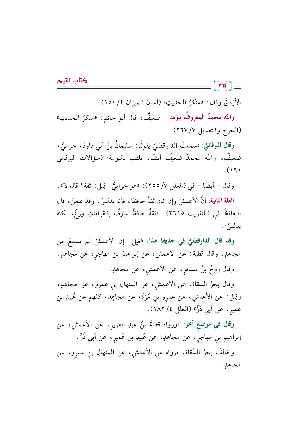 وقد قال الدارقطنيُّ في حديثنا هذا: "قيل: إن الأعمشَ لم يسمعْ من مجاهدٍ، وقال قطبة: عن الأعمشِ، عن إبراهيمَ بنِ مهاجرٍ، عن مجاهدٍ.