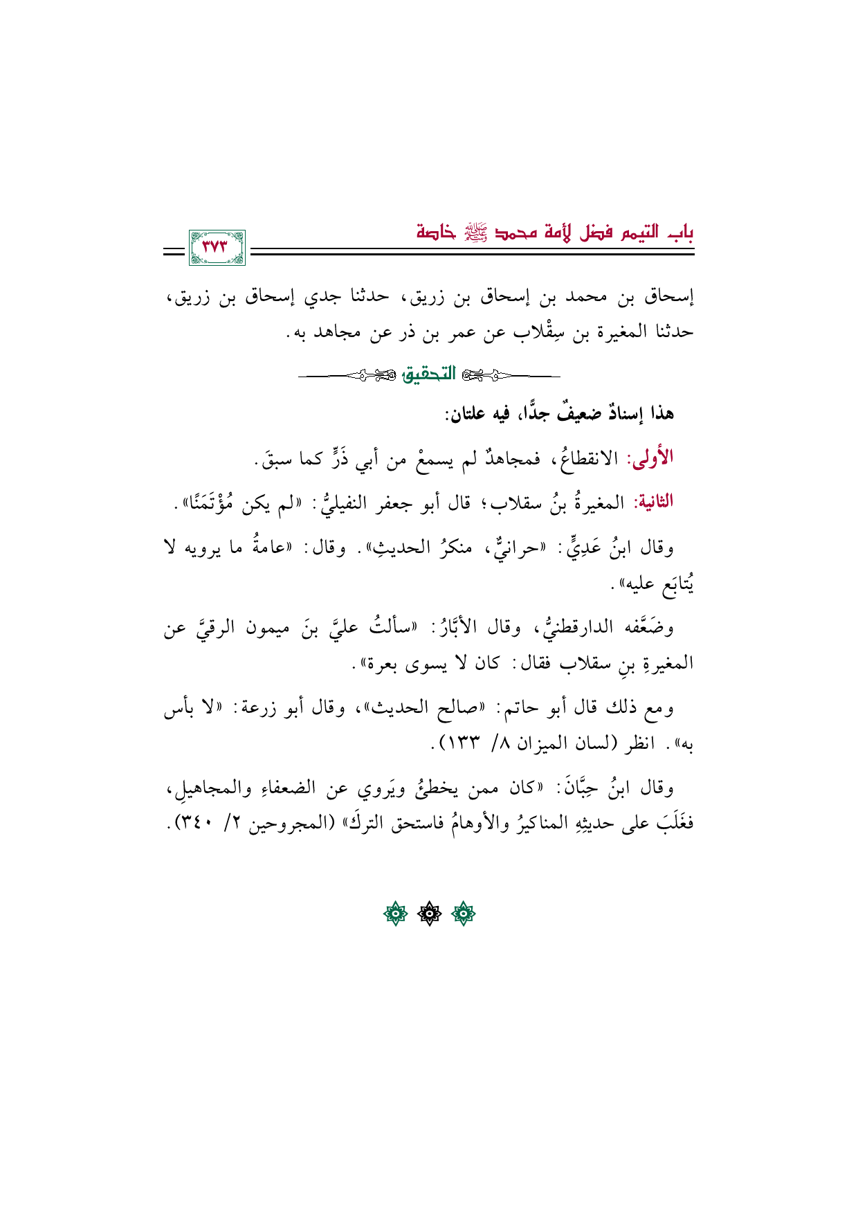 الثانية: المغيرةُ بنُ سقلاب؛ قال أبو جعفر النفيليُّ: "لم يكن مُؤْتَمَنًا".
