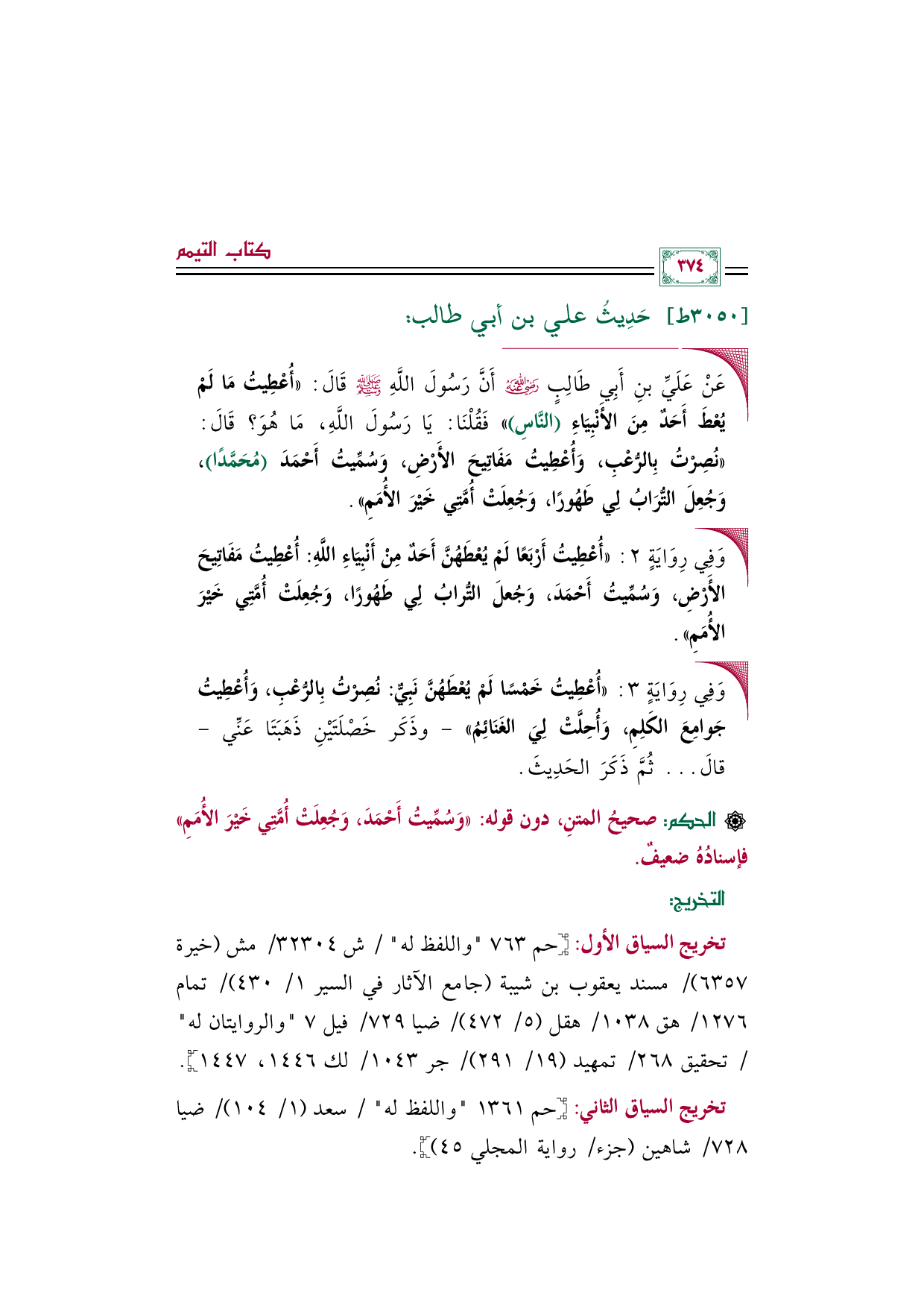 ◼ عَنْ عَلَيِّ بنِ أَبِي طَالِبٍ رضي الله عنه أَنَّ رَسُولَ اللَّهِ صلى الله عليه وسلم قَالَ: ((أُعْطِيتُ مَا لَمْ يُعْطَ أَحَدٌ مِنَ الأَنْبِيَاءِ (النَّاسِ))) فَقُلْنَا: يَا رَسُولَ اللَّهِ، مَا هُوَ؟ قَالَ: ((نُصِرْتُ بِالرُّعْبِ، وَأُعْطِيتُ مَفَاتِيحَ الأَرْضِ، وَسُمِّيتُ أَحْمَدَ (مُحَمَّدًا)، وَجُعِلَ التُّرَابُ لِي طَهُورًا، وَجُعِلَتْ أُمَّتِي خَيْرَ الأُمَمِ)).