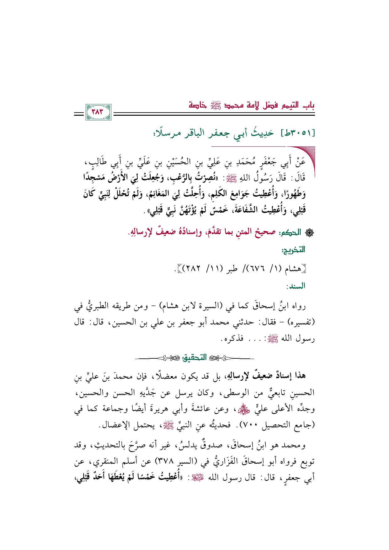 ومحمد هو ابنُ إسحاقَ، صدوقٌ يدلسُ، غير أنه صرَّحَ بالتحديثِ، وقد توبع فرواه أبو إسحاقَ الفَزَاريُّ في (السير ٣٧٨) عن أسلم المنقري، عن أبي جعفرٍ، قال: قال رسول الله عليه السلام: ((أُعْطِيتُ خَمْسًا لَمْ يُعْطَهَا أَحَدٌ قَبْلِي،