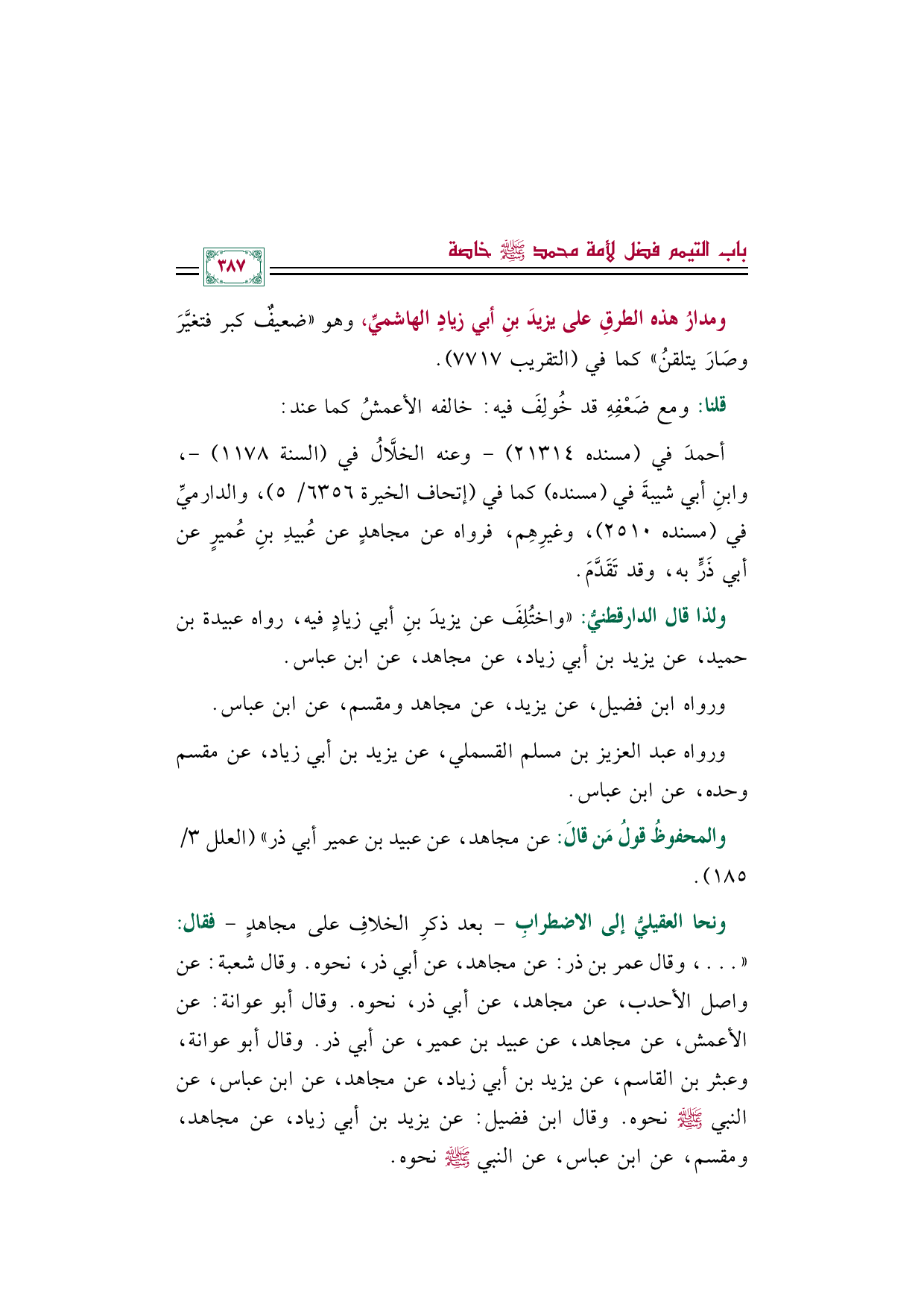 ولذا قال الدارقطنيُّ: "واختُلِفَ عن يزيدَ بنِ أبي زيادٍ فيه، رواه عبيدة بن حميد، عن يزيد بن أبي زياد، عن مجاهد، عن ابن عباس.