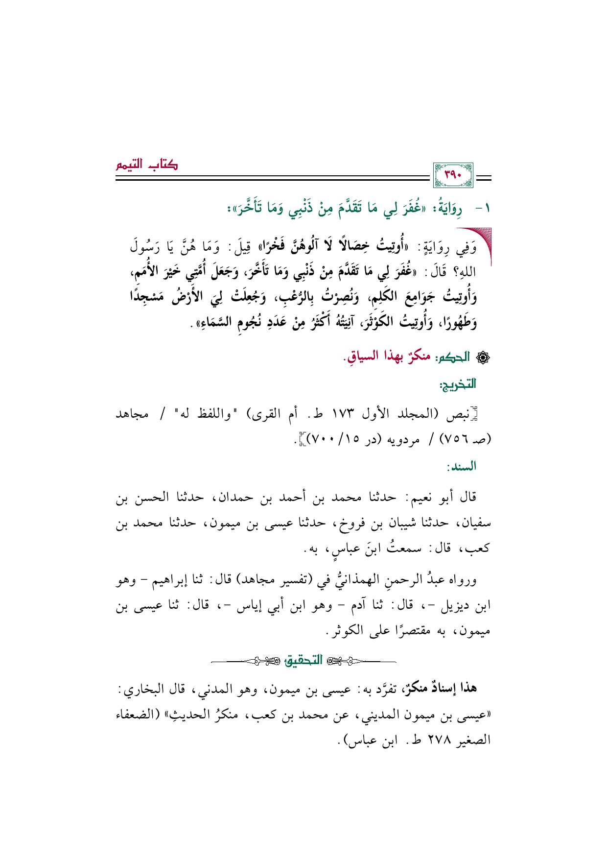 قال أبو نعيم: حدثنا محمد بن أحمد بن حمدان، حدثنا الحسن بن سفيان، حدثنا شيبان بن فروخ، حدثنا عيسى بن ميمون، حدثنا محمد بن كعب، قال: سمعتُ ابنَ عباسٍ، به.