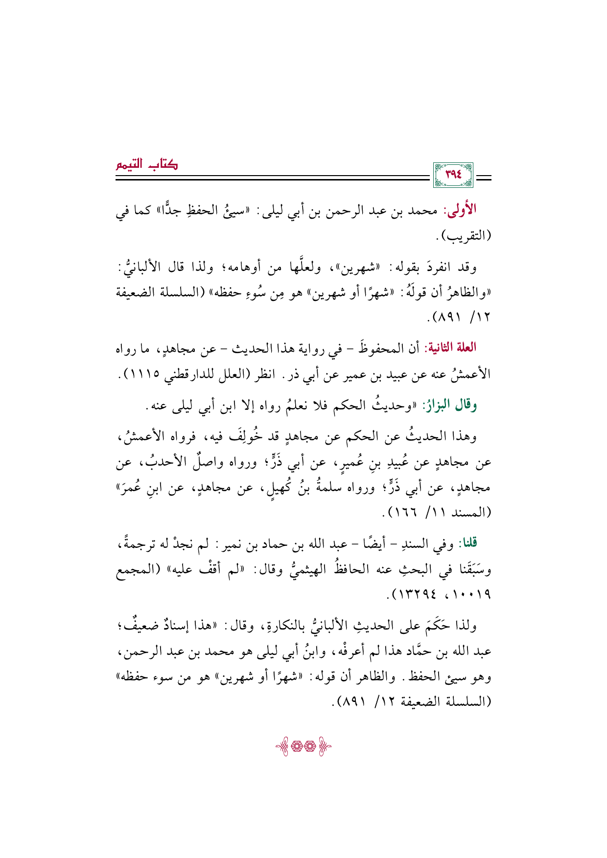 الأولى: محمد بن عبد الرحمن بن أبي ليلى: "سيئُ الحفظِ جدًّا" كما في (التقريب).