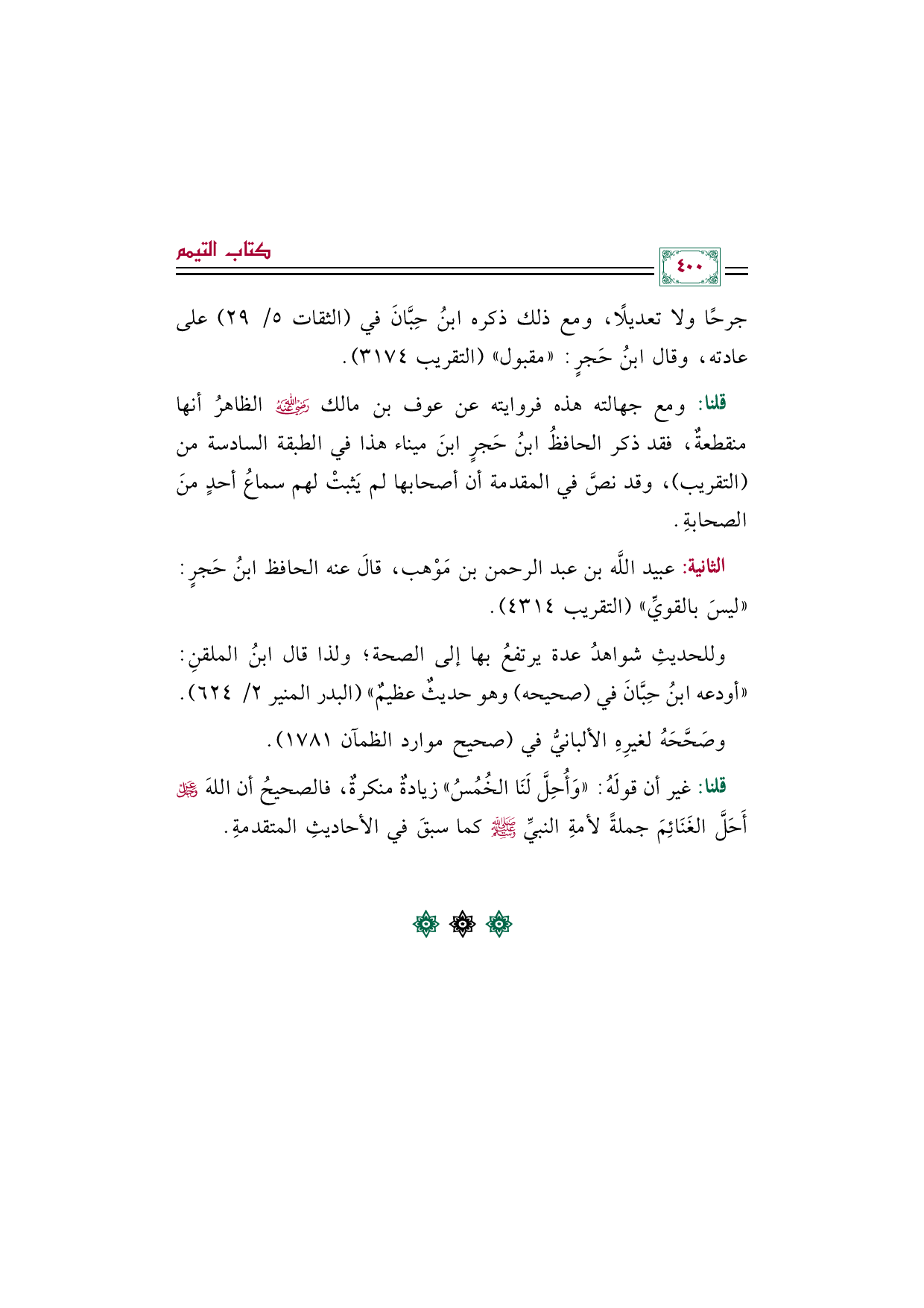 قلنا: ومع جهالته هذه فروايته عن عوف بن مالك رضي الله عنه الظاهرُ أنها منقطعةٌ، فقد ذكر الحافظُ ابنُ حَجرٍ ابنَ ميناء هذا في الطبقة السادسة من (التقريب)، وقد نصَّ في المقدمة أن أصحابها لم يَثبتْ لهم سماعُ أحدٍ منَ الصحابةِ.