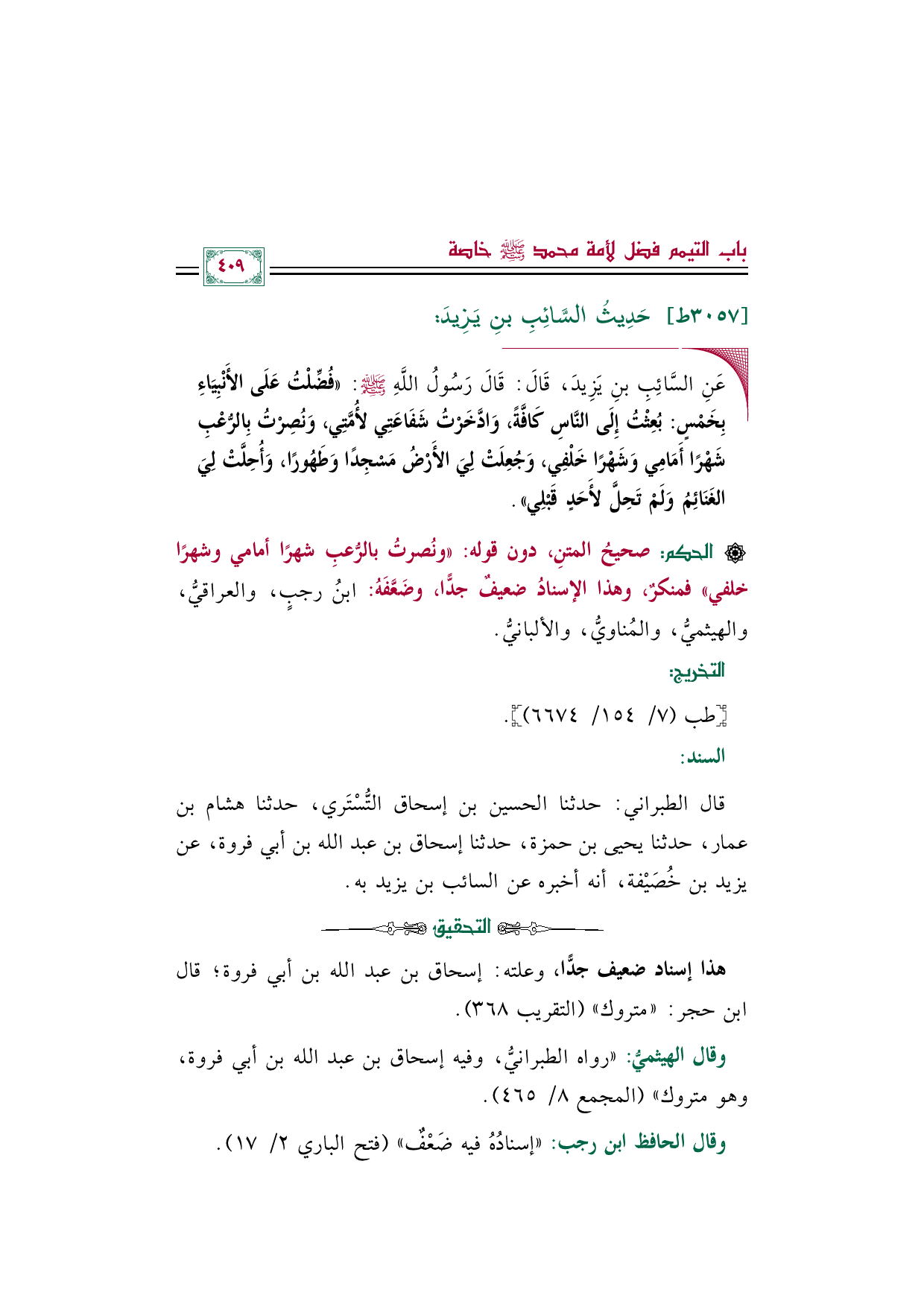 وقال الحافظ ابن رجب: "إسنادُهُ فيه ضَعْفٌ" (فتح الباري ٢/ ١٧).