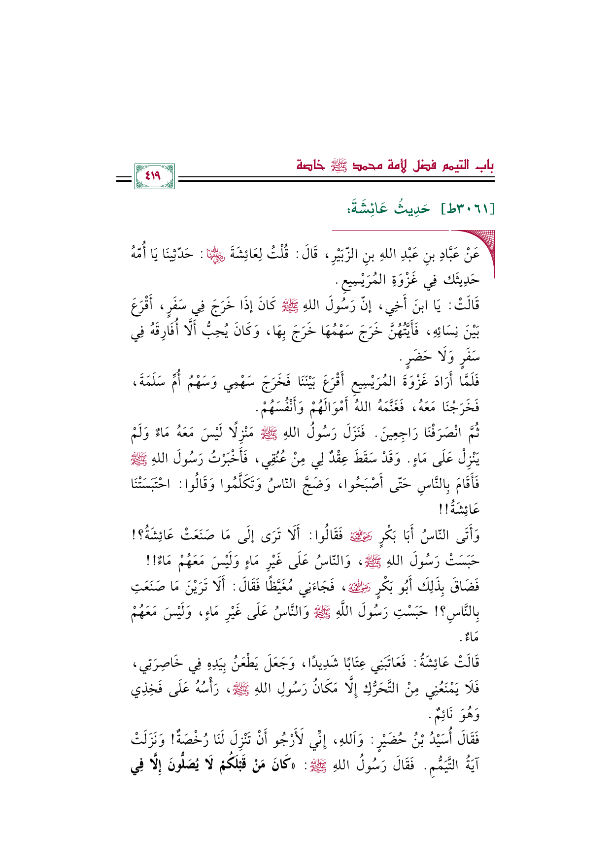 ◼ عَنْ عَبَّادِ بنِ عَبْدِ اللهِ بنِ الزّبَيْرِ، قَالَ: قُلْتُ لِعَائِشَةَ رضي الله عنها: حَدّثِينَا يَا أُمّهُ حَدِيثَك فِي غَزْوَةِ المُرَيْسِيعِ.
