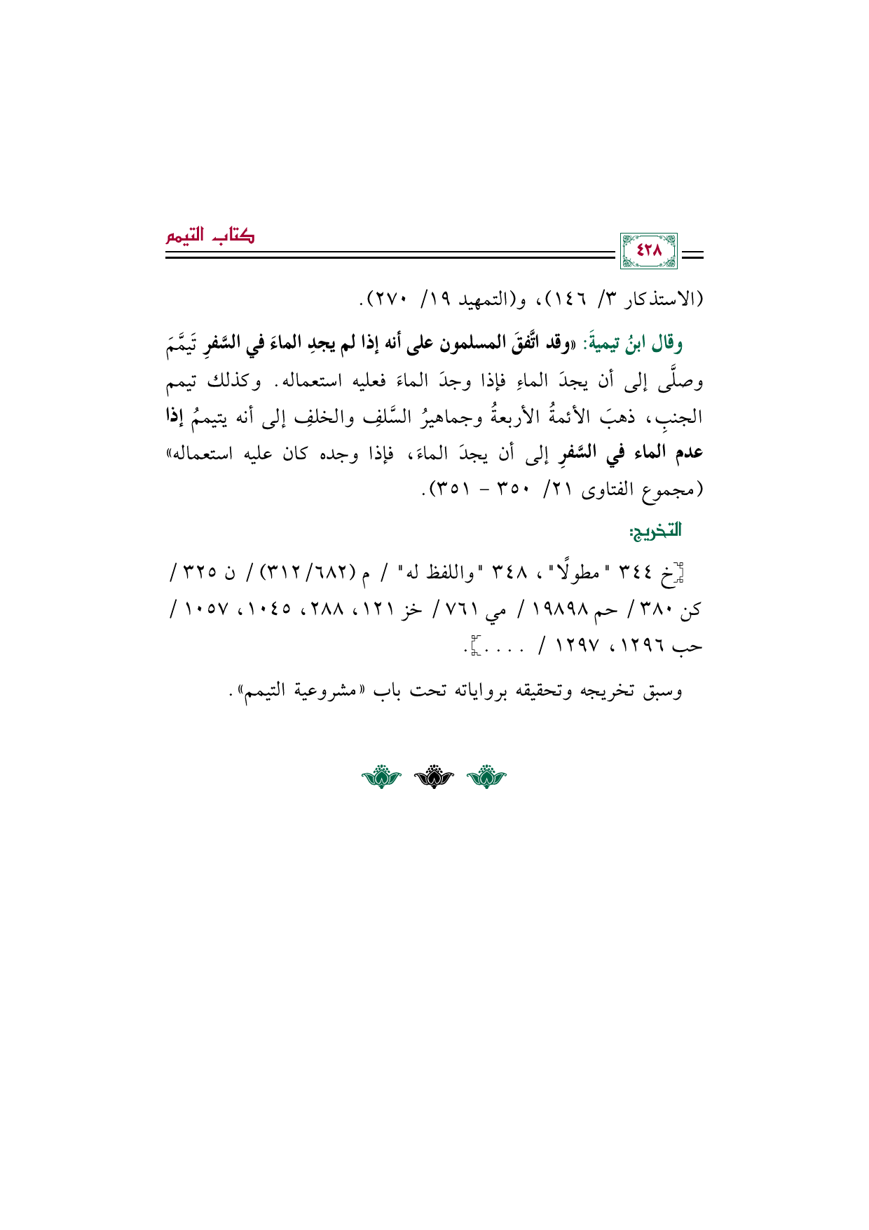 وقال ابنُ تيميةَ: "وقد اتَّفقَ المسلمون على أنه إذا لم يجدِ الماءَ في السَّفرِ تَيمَّمَ وصلَّى إلى أن يجدَ الماءِ فإذا وجدَ الماءَ فعليه استعماله. وكذلك تيمم الجنبِ، ذهبَ الأئمةُ الأربعةُ وجماهيرُ السَّلفِ والخلفِ إلى أنه يتيممُ إذا عدم الماء في السَّفرِ إلى أن يجدَ الماءَ، فإذا وجده كان عليه استعماله" (مجموع الفتاوى ٢١/ ٣٥٠ - ٣٥١).