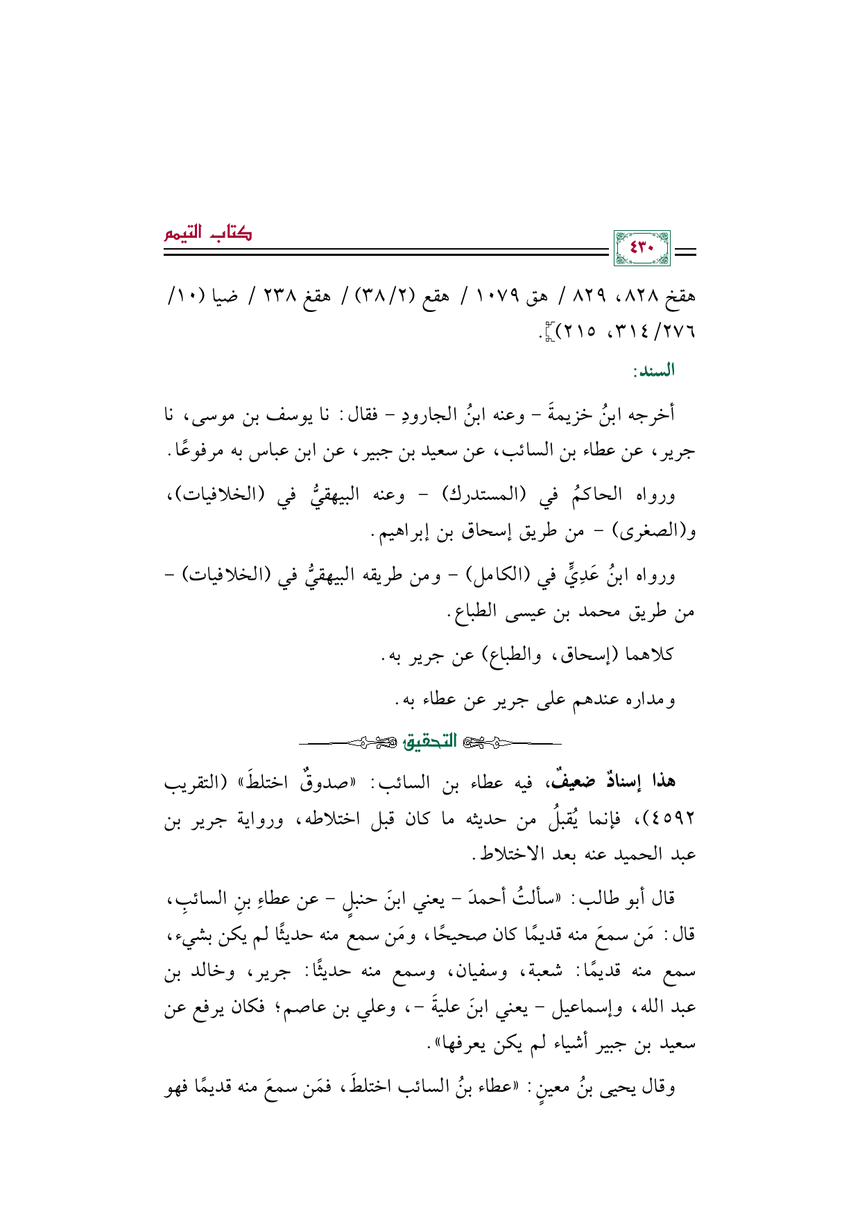 أخرجه ابنُ خزيمةَ -وعنه ابنُ الجارودِ- فقال: نا يوسف بن موسى، نا جرير، عن عطاء بن السائب، عن سعيد بن جبير، عن ابن عباس به مرفوعًا.
