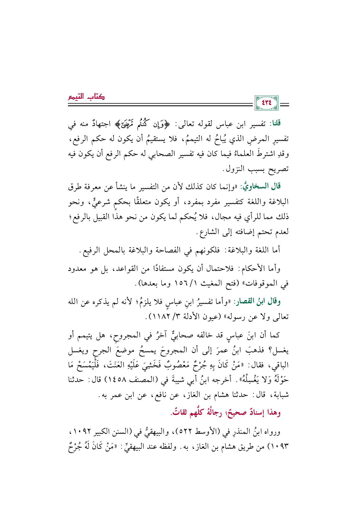 قلنا: تفسير ابن عباس لقوله تعالى: {وإن كنتم مرضى} اجتهادٌ منه في تفسيرِ المرضِ الذي يُباحُ له التيممُ، فلا يستقيمُ أن يكون له حكم الرفع، وقدِ اشترطَ العلماءُ فيما كان فيه تفسير الصحابي له حكم الرفع أن يكون فيه تصريح بسبب النزول.