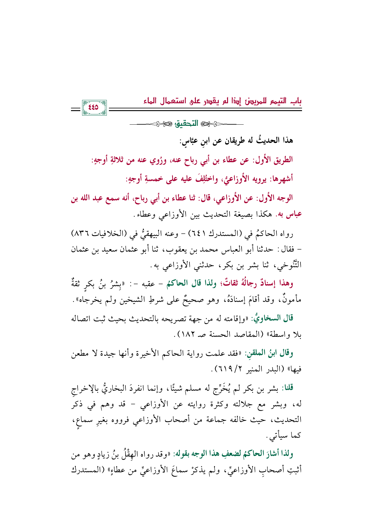 ولذا أشارَ الحاكمُ لضعفِ هذا الوجه بقوله: "وقد رواه الهِقْلُ بنُ زيادٍ وهو من أثبتِ أصحابِ الأوزاعيِّ، ولم يذكرْ سماعَ الأوزاعيِّ من عطاءٍ" (المستدرك