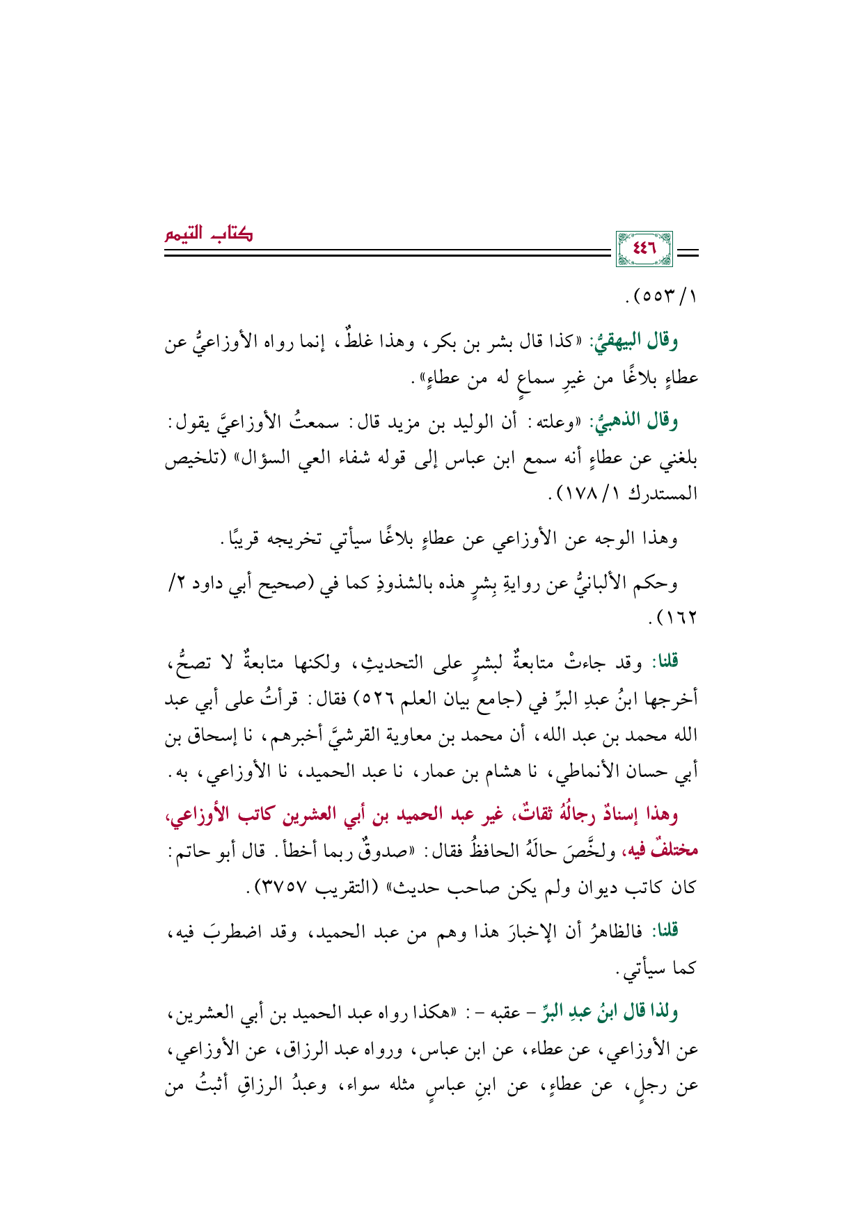 قلنا: وقد جاءتْ متابعةٌ لبشرٍ على التحديثِ، ولكنها متابعةٌ لا تصحُّ، أخرجها ابنُ عبدِ البرِّ في (جامع بيان العلم ٥٢٦) فقال: قرأتُ على أبي عبد الله محمد بن عبد الله، أن محمد بن معاوية القرشيَّ أخبرهم، نا إسحاق بن أبي حسان الأنماطي، نا هشام بن عمار، نا عبد الحميد، نا الأوزاعي، به.