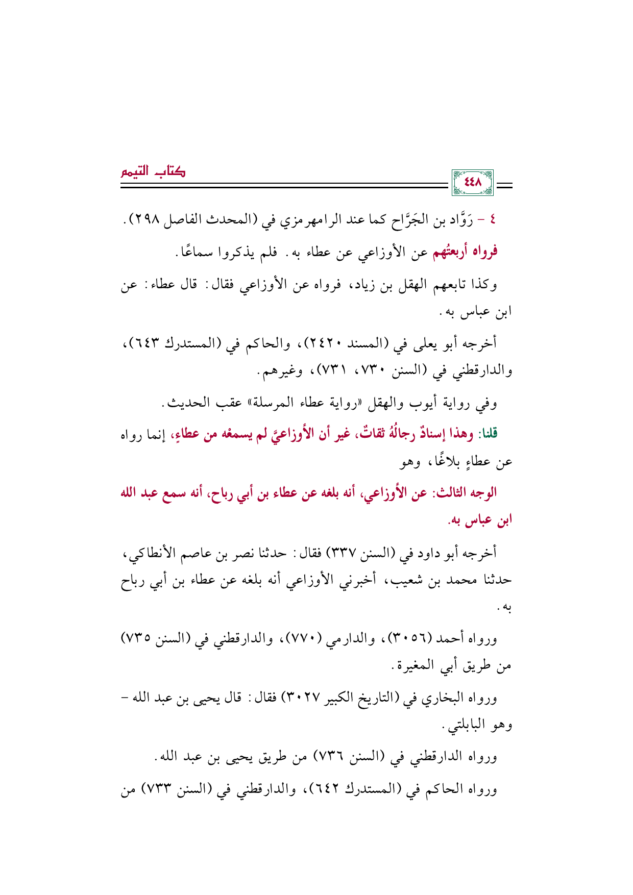 قلنا: وهذا إسنادٌ رجالُهُ ثقاتٌ، غير أن الأوزاعيَّ لم يسمعْه من عطاءٍ، إنما رواه عن عطاءٍ بلاغًا، وهو