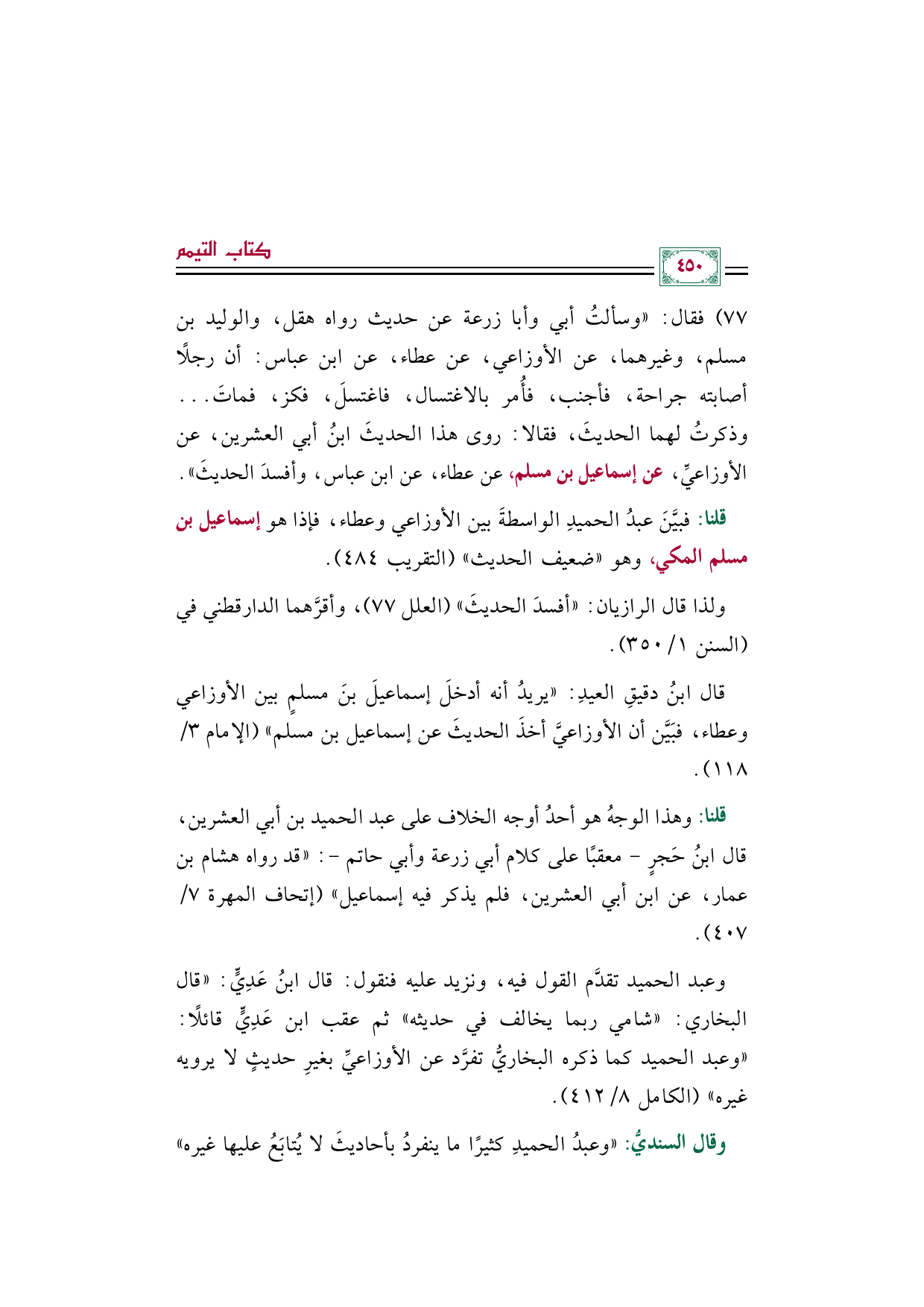 ٧٧) فقال: "وسألتُ أبي وأبا زرعة عن حديث رواه هقل، والوليد بن مسلم، وغيرهما، عن الأوزاعي، عن عطاء، عن ابن عباس: أن رجلًا أصابته جراحة، فأجنب، فأُمر بالاغتسال، فاغتسلَ، فكز، فماتَ ... وذكرتُ لهما الحديثَ، فقالا: روى هذا الحديثَ ابنُ أبي العشرين، عن الأوزاعيِّ، عن إسماعيل بن مسلم، عن عطاء، عن ابن عباس، وأفسدَ الحديثَ".