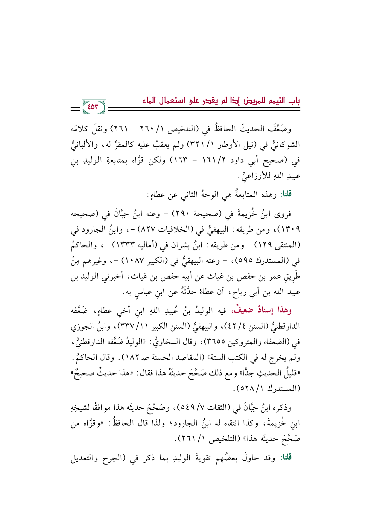 وهذا إسنادٌ ضعيفٌ، فيه الوليدُ بنُ عُبيدِ اللهِ ابنِ أخي عطاءٍ، ضَعَّفه الدارقطنيُّ (السنن ٤/ ٤٢)، والبيهقيُّ (السنن الكبير ١١/ ٣٣٧)، وابنُ الجوزي في (الضعفاء والمتروكين ٣٦٥٥)، وقال السخاويُّ: "الوليدُ ضَعَّفه الدارقطنيُّ، ولم يخرج له في الكتب الستة" (المقاصد الحسنة صـ ١٨٢). وقال الحاكمُ: "قليلُ الحديثِ جدًّا" ومع ذلك صَحَّحَ حديثَهُ هذا فقال: "هذا حديثٌ صحيحٌ" (المستدرك ١/ ٥٢٨).