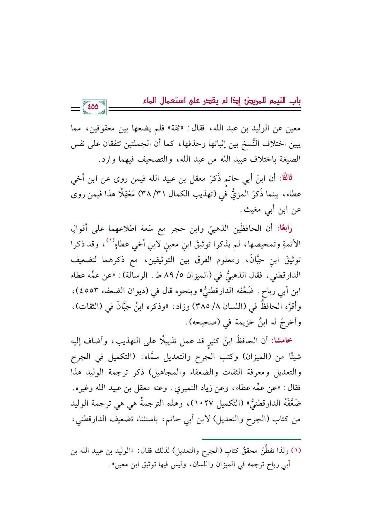 خامسًا: أن الحافظَ ابنَ كثيرٍ قد عمل تذييلًا على التهذيب، وأضاف إليه شيئًا من (الميزان) وكتب الجرح والتعديل سمَّاه: (التكميل في الجرح والتعديل ومعرفة الثقات والضعفاء والمجاهيل) ذكر ترجمة الوليد هذا فقال: "عن عمِّه عطاء، وعن زياد النميري. وعنه معقل بن عبيد الله وغيره. ضَعَّفَهُ الدارقطنيُّ" (التكميل ١٠٢٧)، وهذه الترجمةُ هي هي ترجمة الوليد من كتاب (الجرح والتعديل) لابن أبي حاتم، باستثناء تضعيف الدارقطني،