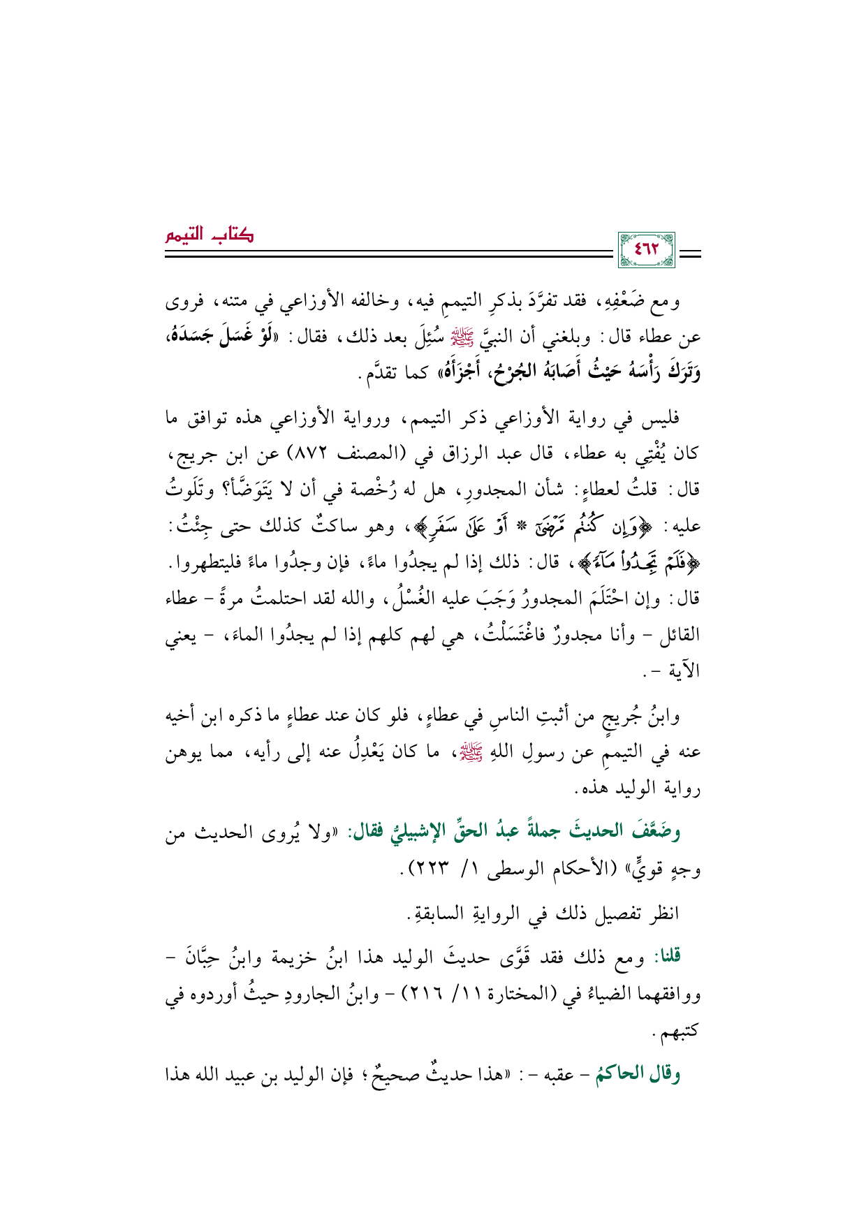 وابنُ جُريجٍ من أثبتِ الناسِ في عطاءٍ، فلو كان عند عطاءٍ ما ذكره ابن أخيه عنه في التيممِ عن رسولِ اللهِ صلى الله عليه وسلم، ما كان يَعْدِلُ عنه إلى رأيه، مما يوهن رواية الوليد هذه.