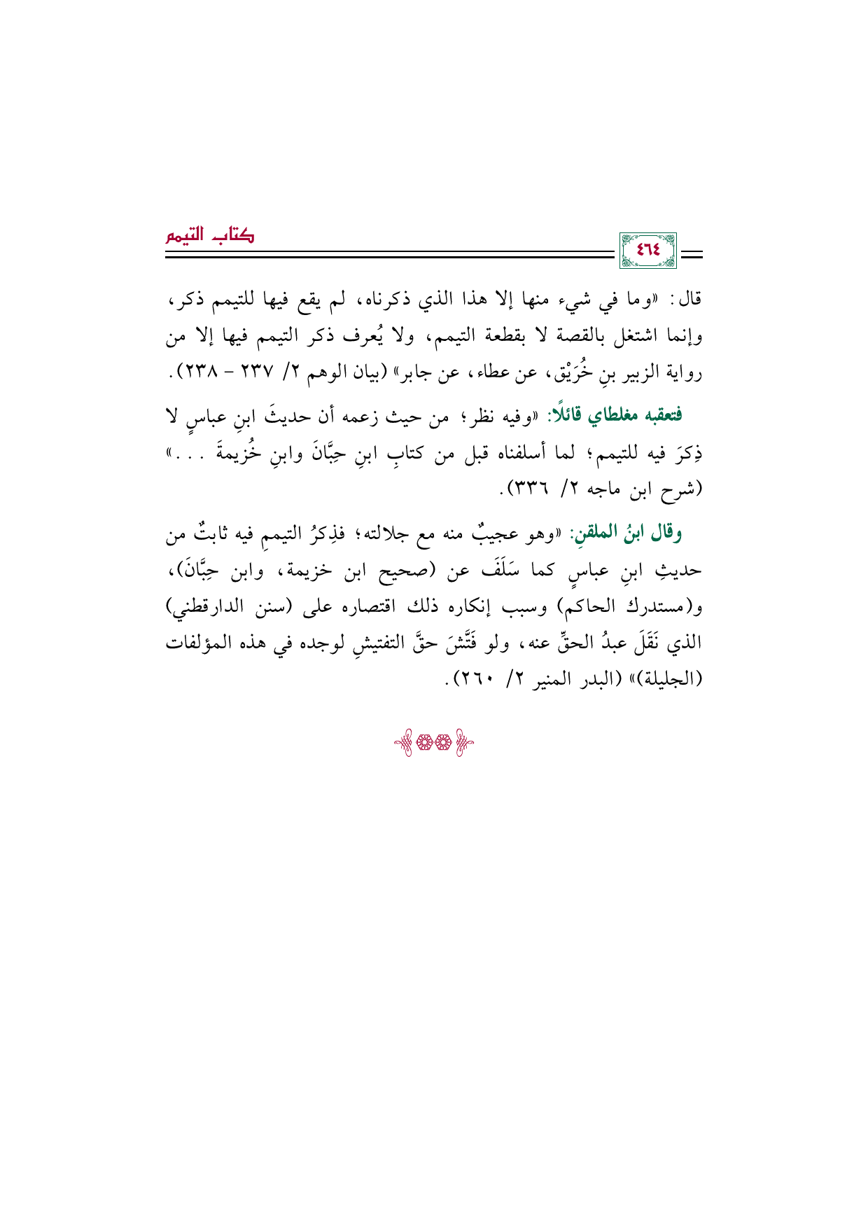 فتعقبه مغلطاي قائلًا: "وفيه نظر؛ من حيث زعمه أن حديثَ ابنِ عباسٍ لا ذِكرَ فيه للتيمم؛ لما أسلفناه قبل من كتابِ ابنِ حِبَّانَ وابنِ خُزيمةَ ... " (شرح ابن ماجه ٢/ ٣٣٦).