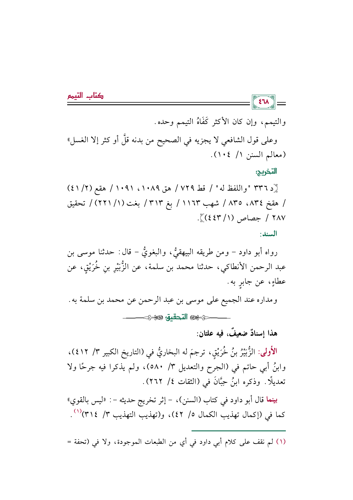 (¬١) لم نقف على كلام أبي داود في أي من الطبعات الموجودة، ولا في (تحفة الأشراف)، ولا أي من شارحي السنن؛ ولذا قال الشيخ بشار عواد: "وزعم العلامة مغلطاي -وتابعه ابنُ حجرٍ على عادتِهِ- أن أبا داود قال في كتاب السنن إثر تخريج حديثه: "ليس بالقوي".