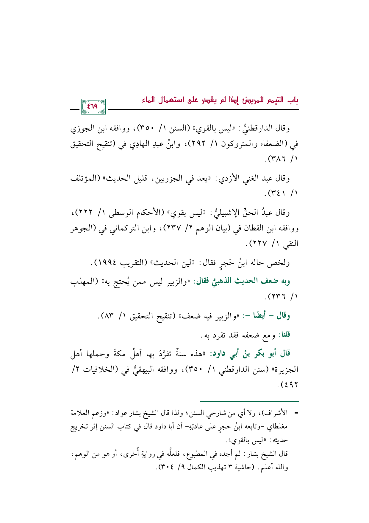 وقال -أيضًا-: "والزبير فيه ضعف" (تنقيح التحقيق ١/ ٨٣).