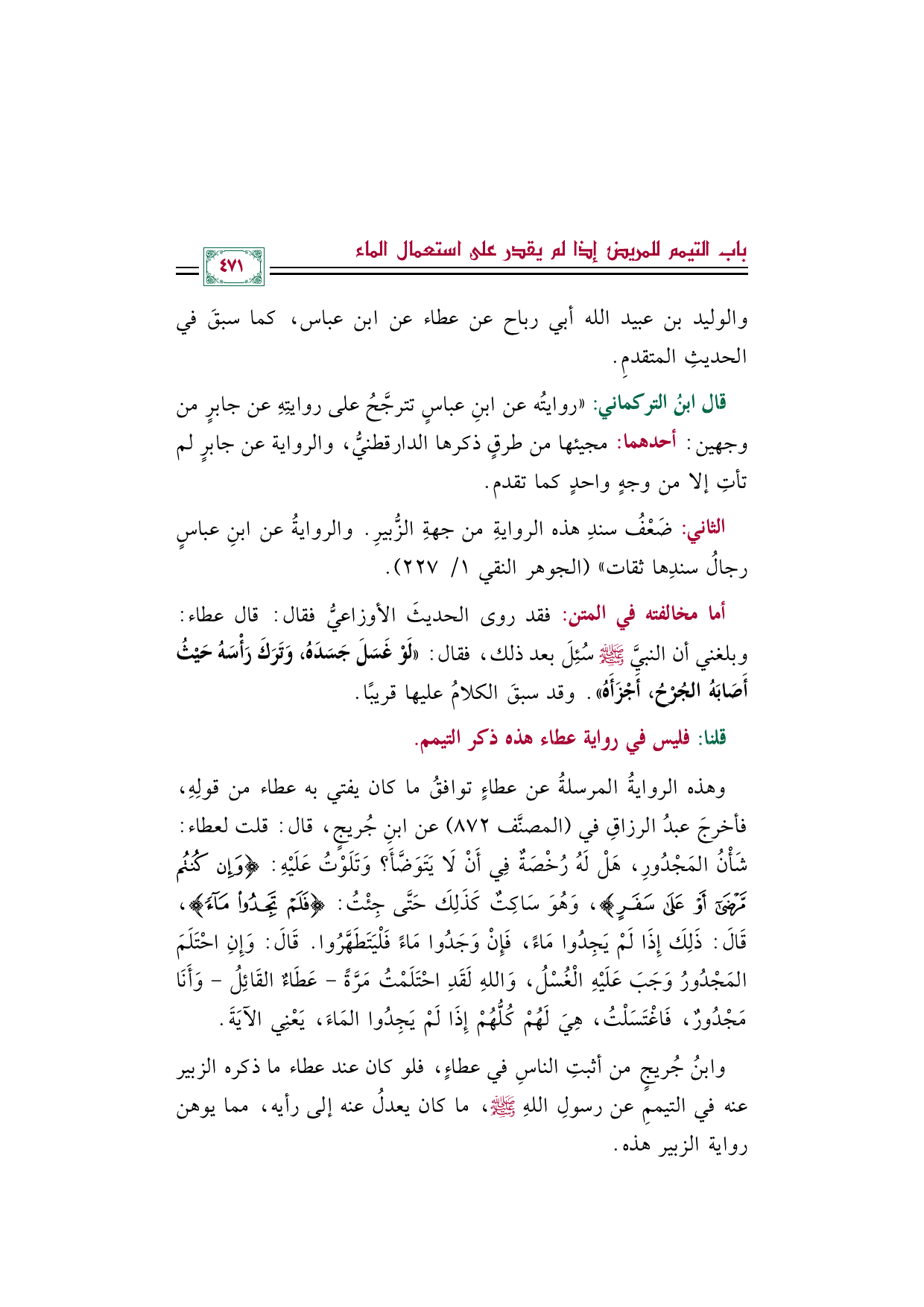 وابنُ جُريجٍ من أثبتِ الناسِ في عطاءٍ، فلو كان عند عطاء ما ذكره الزبير عنه في التيممِ عن رسولِ اللهِ صلى الله عليه وسلم، ما كان يعدلُ عنه إلى رأيه، مما يوهن رواية الزبير هذه.