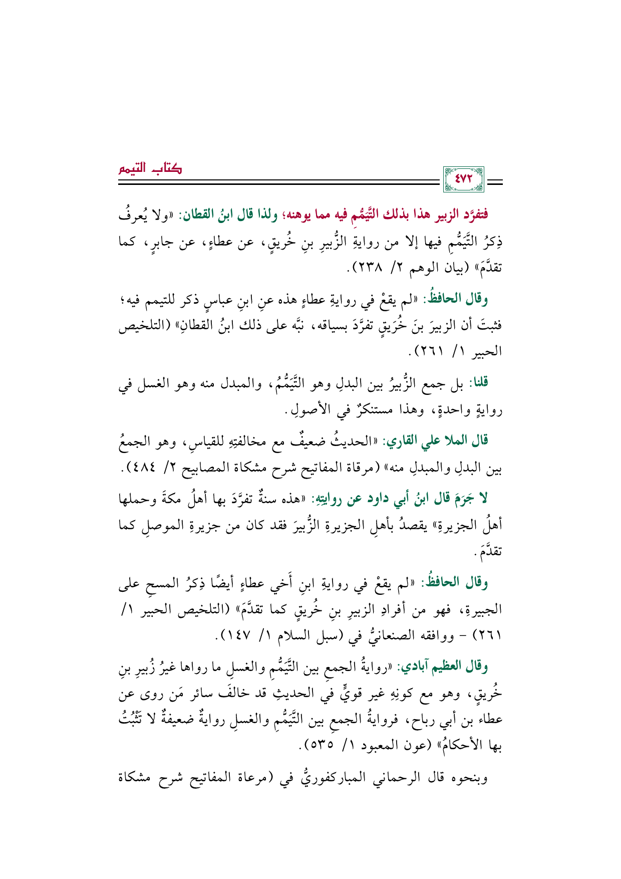 وقال الحافظُ: "لم يقعْ في روايةِ عطاءٍ هذه عنِ ابنِ عباسٍ ذكر للتيمم فيه؛ فثبتَ أن الزبيرَ بنَ خُرَيقٍ تفرَّدَ بسياقه، نبَّه على ذلك ابنُ القطانِ" (التلخيص الحبير ١/ ٢٦١).
