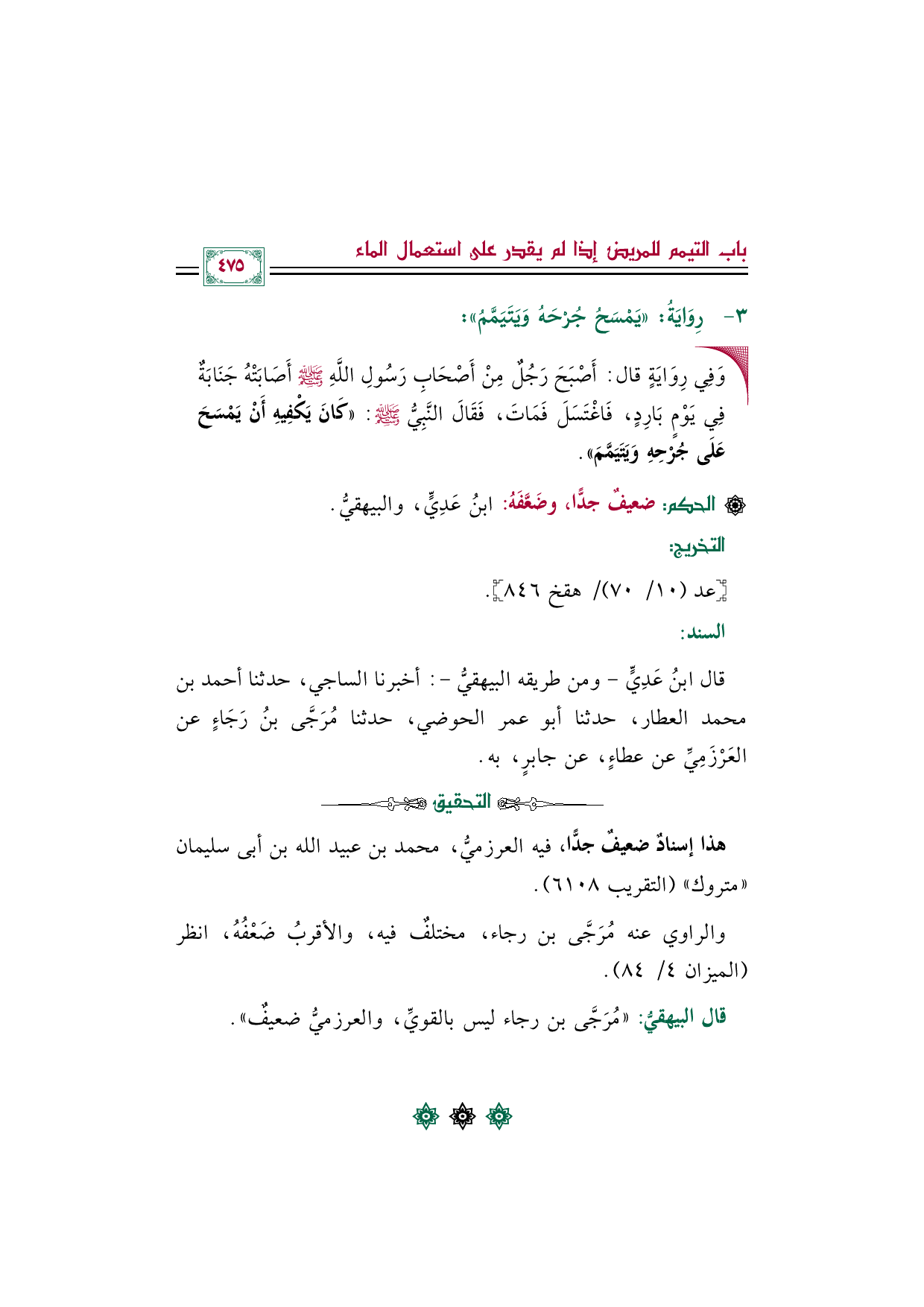 قال البيهقيُّ: " مُرَجَّى بن رجاء ليس بالقويِّ، والعرزميُّ ضعيفٌ".