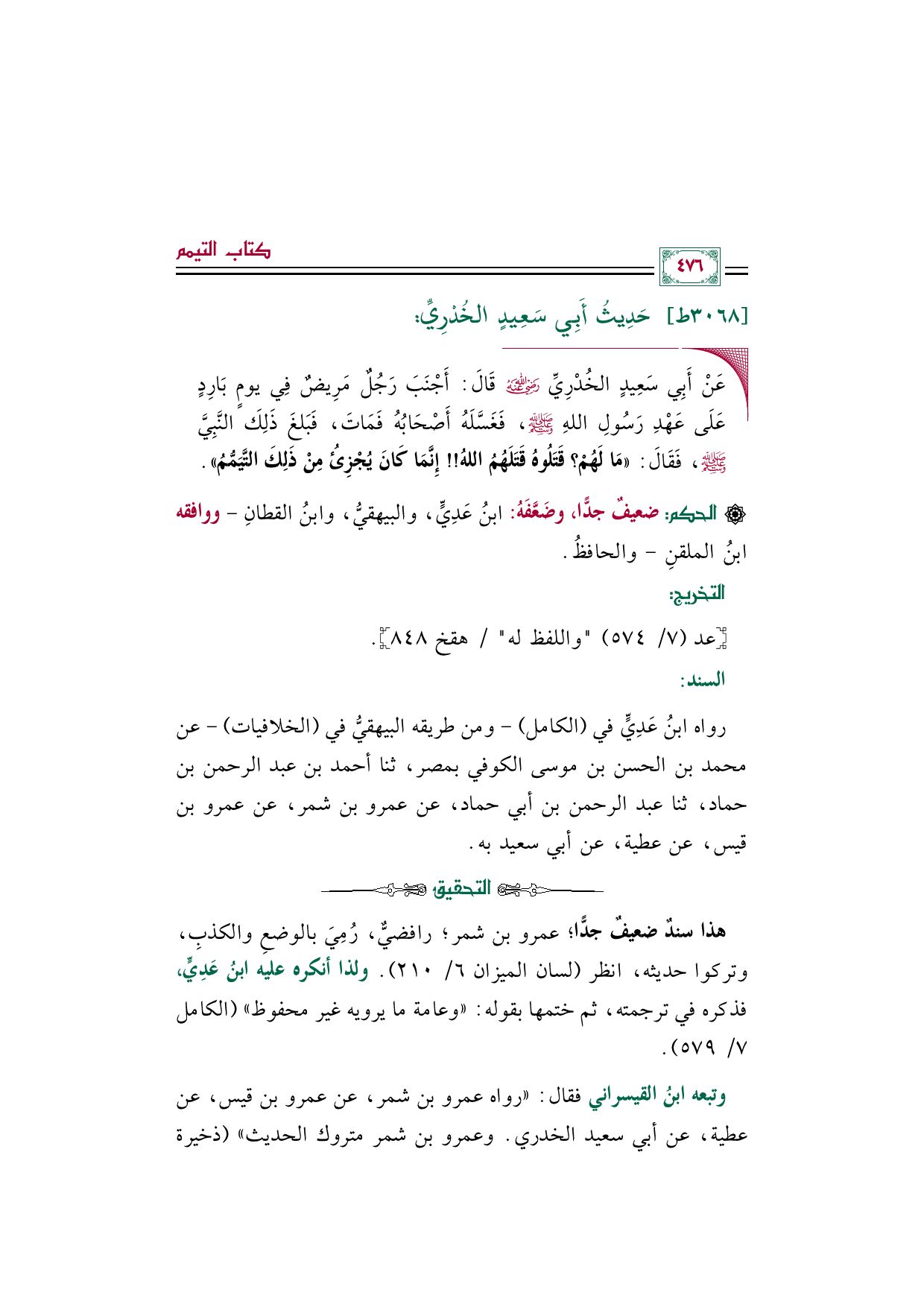 وتبعه ابنُ القيسراني فقال: "رواه عمرو بن شمر، عن عمرو بن قيس، عن عطية، عن أبي سعيد الخدري. وعمرو بن شمر متروك الحديث" (ذخيرة