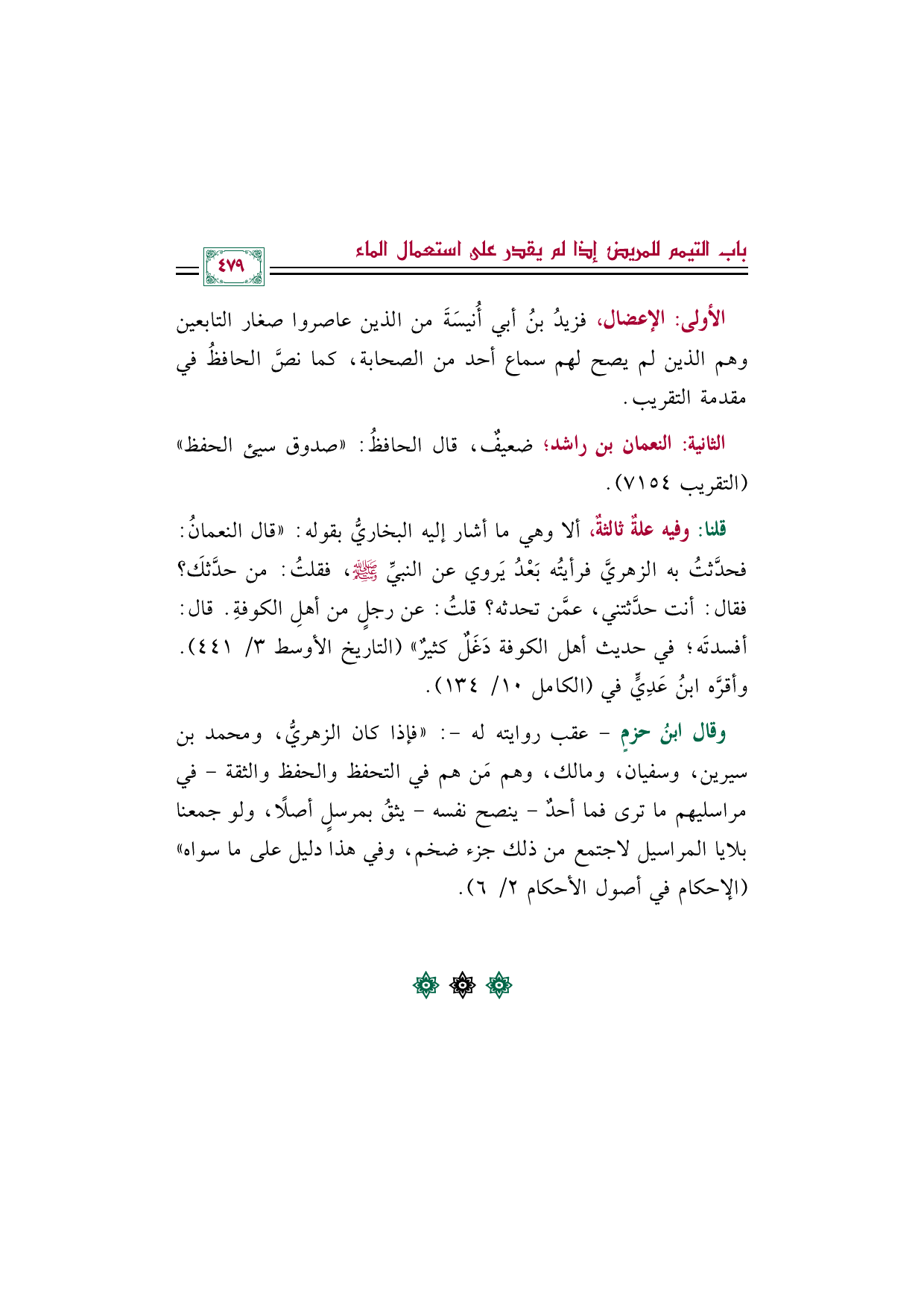 قلنا: وفيه علةٌ ثالثةٌ، ألا وهي ما أشار إليه البخاريُّ بقوله: "قال النعمانُ: فحدَّثتُ به الزهريَّ فرأيتُه بَعْدُ يَروي عن النبيِّ صلى الله عليه وسلم، فقلتُ: من حدَّثكَ؟ فقال: أنت حدَّثتني، عمَّن تحدثه؟ قلتُ: عن رجلٍ من أهلِ الكوفةِ. قال: أفسدتَه؛ في حديث أهل الكوفة دَغَلٌ كثيرٌ" (التاريخ الأوسط ٣/ ٤٤١). وأقرَّه ابنُ عَدِيٍّ في (الكامل ١٠/ ١٣٤).