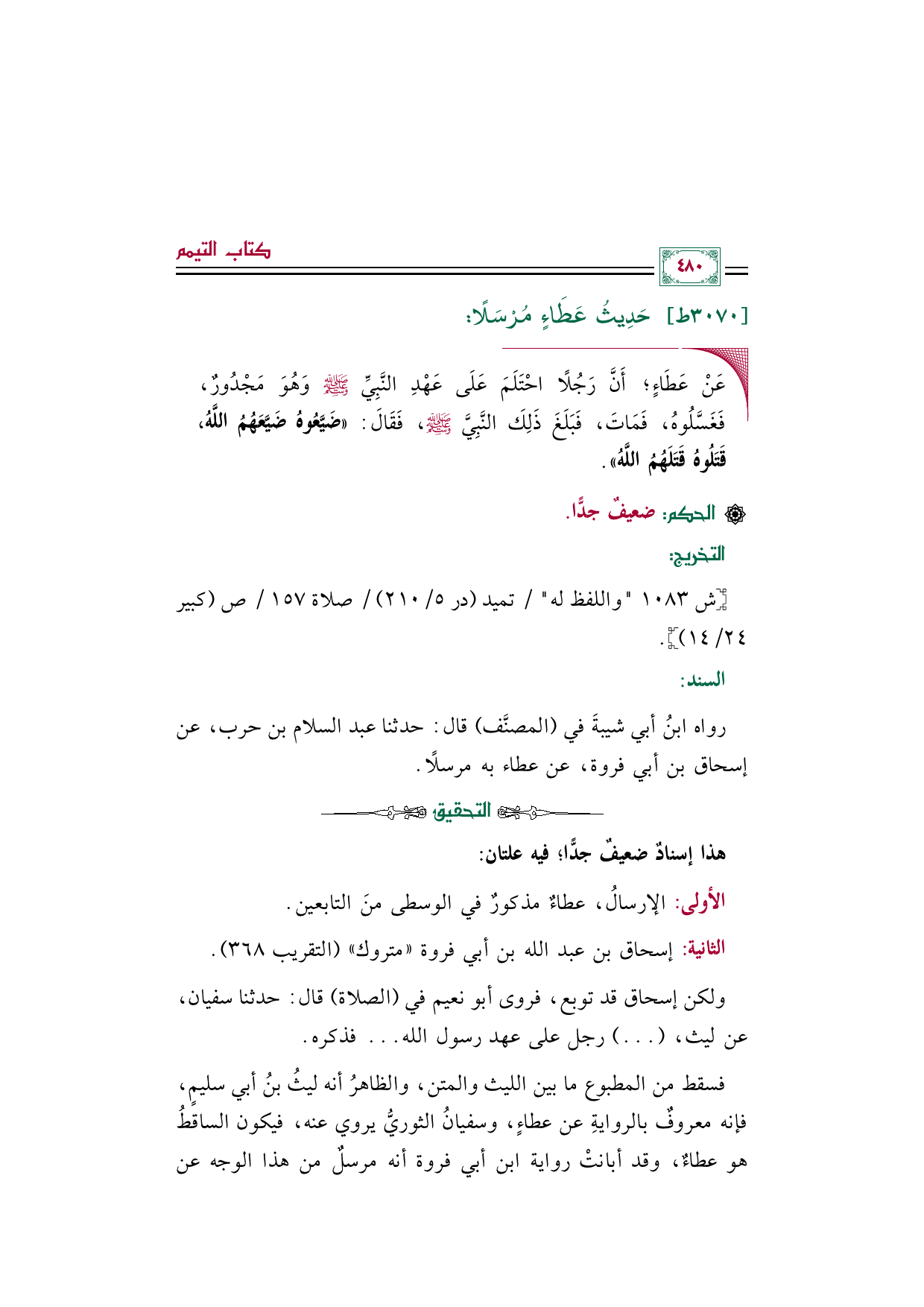 رواه ابنُ أبي شيبةَ في (المصنَّف) قال: حدثنا عبد السلام بن حرب، عن إسحاق بن أبي فروة، عن عطاء به مرسلًا.