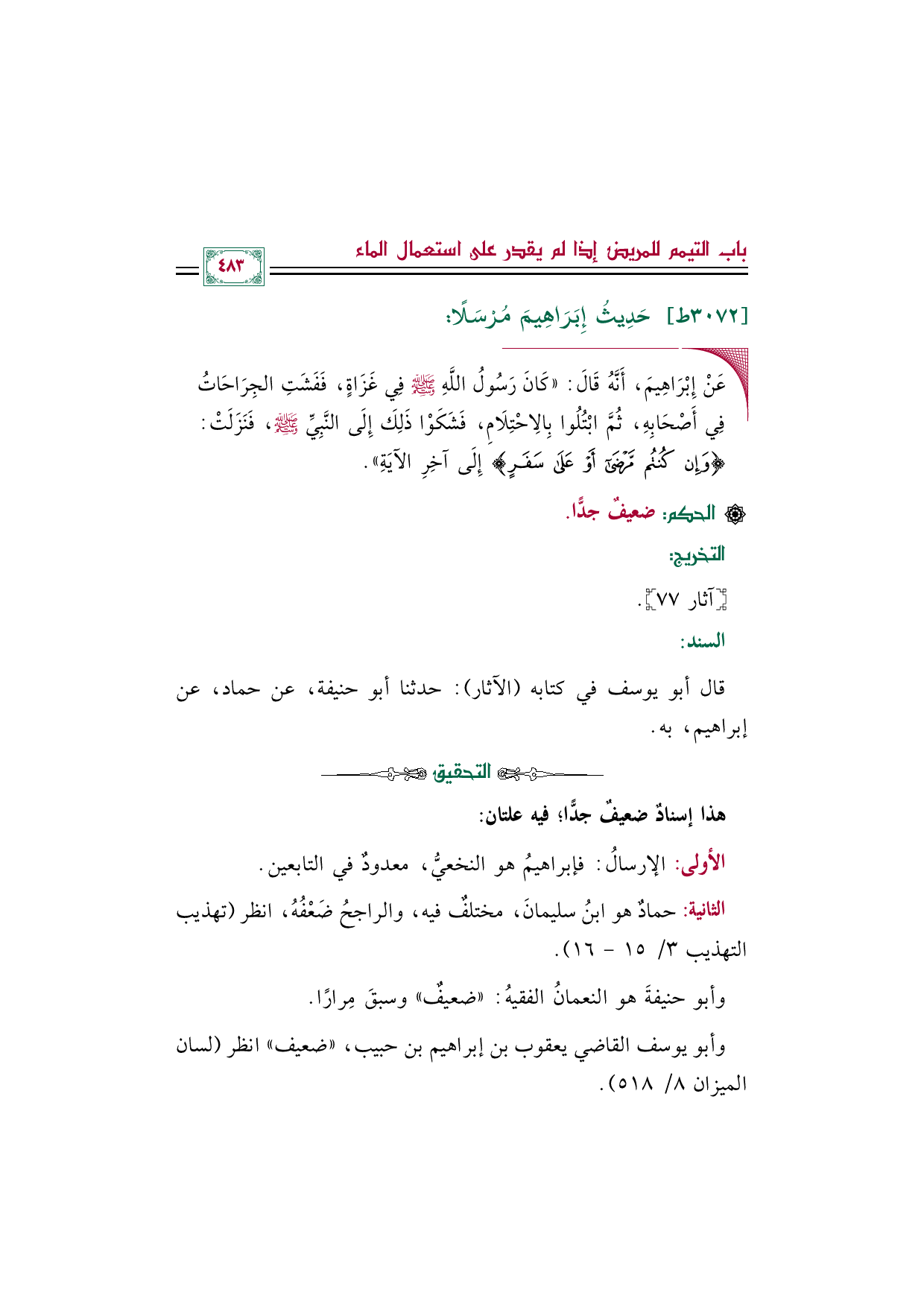 الثانية: حمادٌ هو ابنُ سليمانَ، مختلفٌ فيه، والراجحُ ضَعْفُهُ، انظر (تهذيب التهذيب ٣/ ١٥ - ١٦).