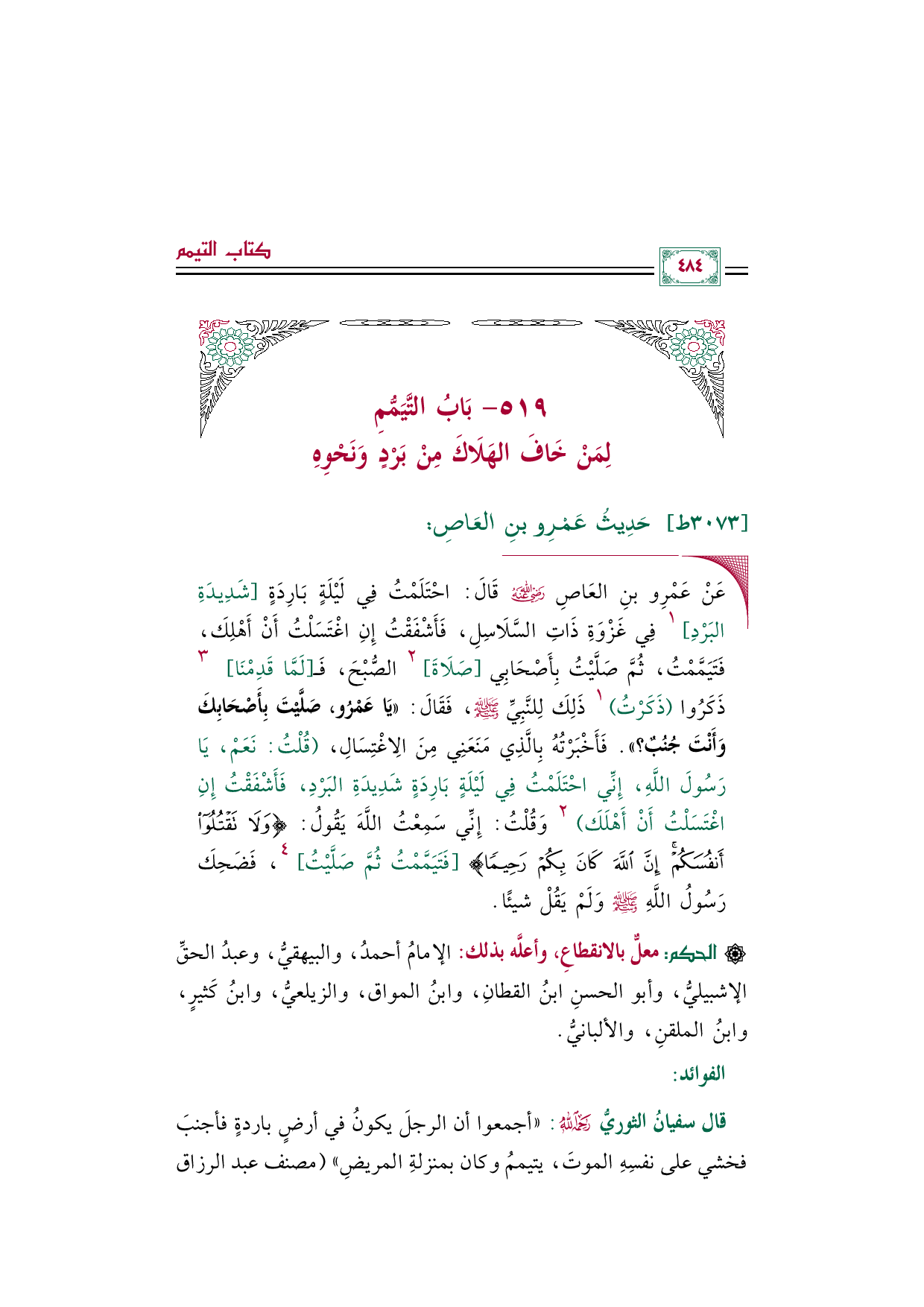 ◼ عَنْ عَمْرِو بنِ العَاصِ رضي الله عنه قَالَ: احْتَلَمْتُ فِي لَيْلَةٍ بَارِدَةٍ [شَدِيدَةِ البَرْدِ] ١ فِي غَزْوَةِ ذَاتِ السَّلَاسِلِ، فَأَشْفَقْتُ إِنِ اغْتَسَلْتُ أَنْ أَهْلِكَ، فَتَيَمَّمْتُ، ثُمَّ صَلَّيْتُ بِأَصْحَابِي [صَلَاةَ] ٢ الصُّبْحَ، فَـ[لَمَّا قَدِمْنَا] ٣ ذَكَرُوا (ذَكَرْتُ) ١ ذَلِكَ لِلنَّبِيِّ صلى الله عليه وسلم، فَقَالَ: ((يَا عَمْرُو، صَلَّيْتَ بِأَصْحَابِكَ وَأَنْتَ جُنُبٌ؟ )). فَأَخْبَرْتُهُ بِالَّذِي مَنَعَنِي مِنَ الِاغْتِسَالِ، (قُلْتُ: نَعَمْ، يَا رَسُولَ اللَّهِ، إِنِّي احْتَلَمْتُ فِي لَيْلَةٍ بَارِدَةٍ شَدِيدَةِ البَرْدِ، فَأَشْفَقْتُ إِنِ اغْتَسَلْتُ أَنْ أَهْلَكَ) ٢ وَقُلْتُ: إِنِّي سَمِعْتُ اللَّهَ يَقُولُ: {وَلَا تَقْتُلُوا أَنْفُسَكُمْ إِنَّ اللَّهَ كَانَ بِكُمْ رَحِيمًا} [فَتَيَمَّمْتُ ثُمَّ صَلَّيْتُ] ٤، فَضَحِكَ رَسُولُ اللَّهِ صلى الله عليه وسلم وَلَمْ يَقُلْ شيئًا.
