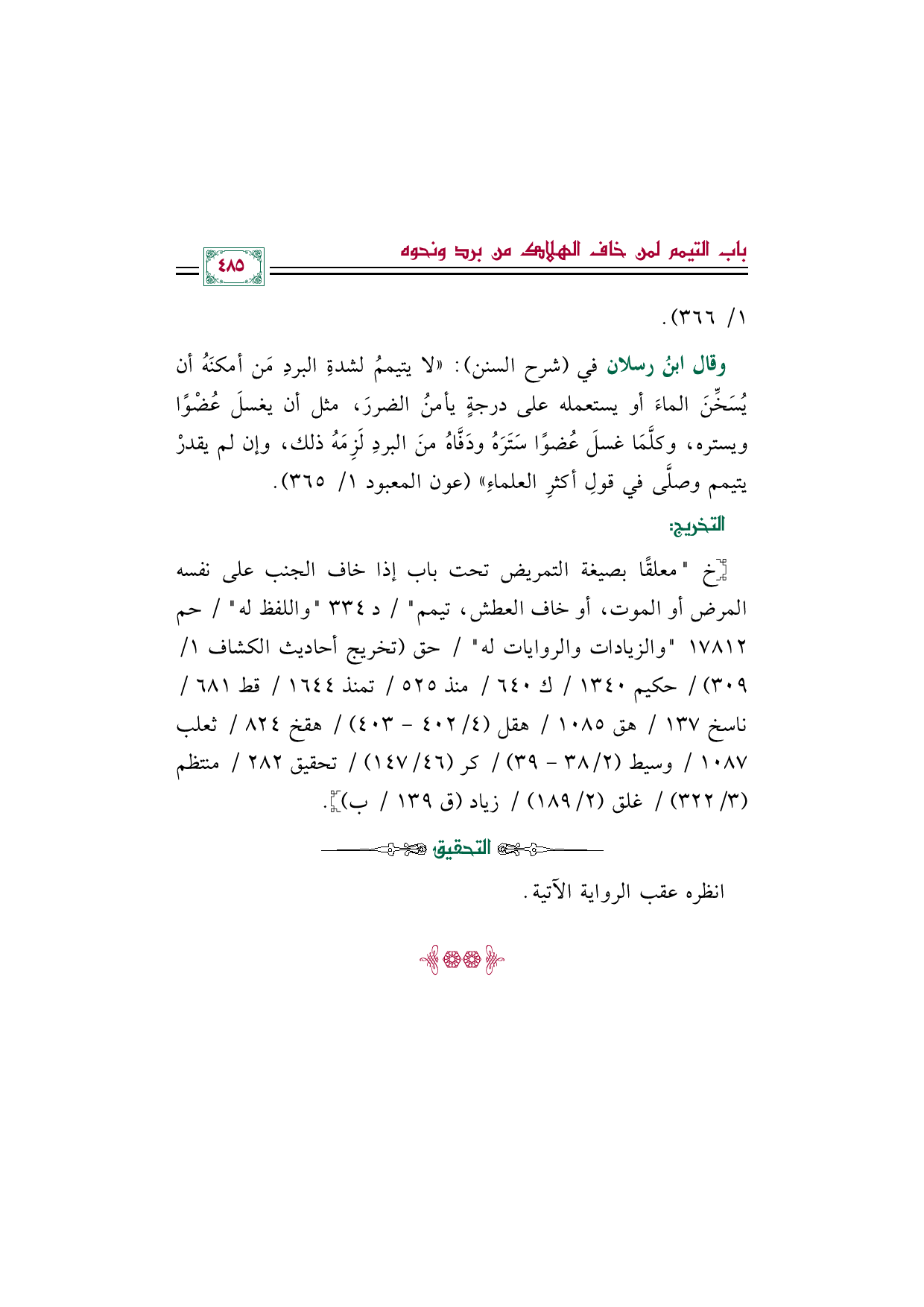 وقال ابنُ رسلان في (شرح السنن): "لا يتيممُ لشدةِ البردِ مَن أمكنَهُ أن يُسَخِّنَ الماءَ أو يستعمله على درجةٍ يأمنُ الضررَ، مثل أن يغسلَ عُضْوًا ويستره، وكلَّمَا غسلَ عُضوًا سَتَرَهُ ودَفَّاهُ منَ البردِ لَزِمَهُ ذلك، وإن لم يقدرْ يتيمم وصلَّى في قولِ أكثرِ العلماءِ" (عون المعبود ١/ ٣٦٥).