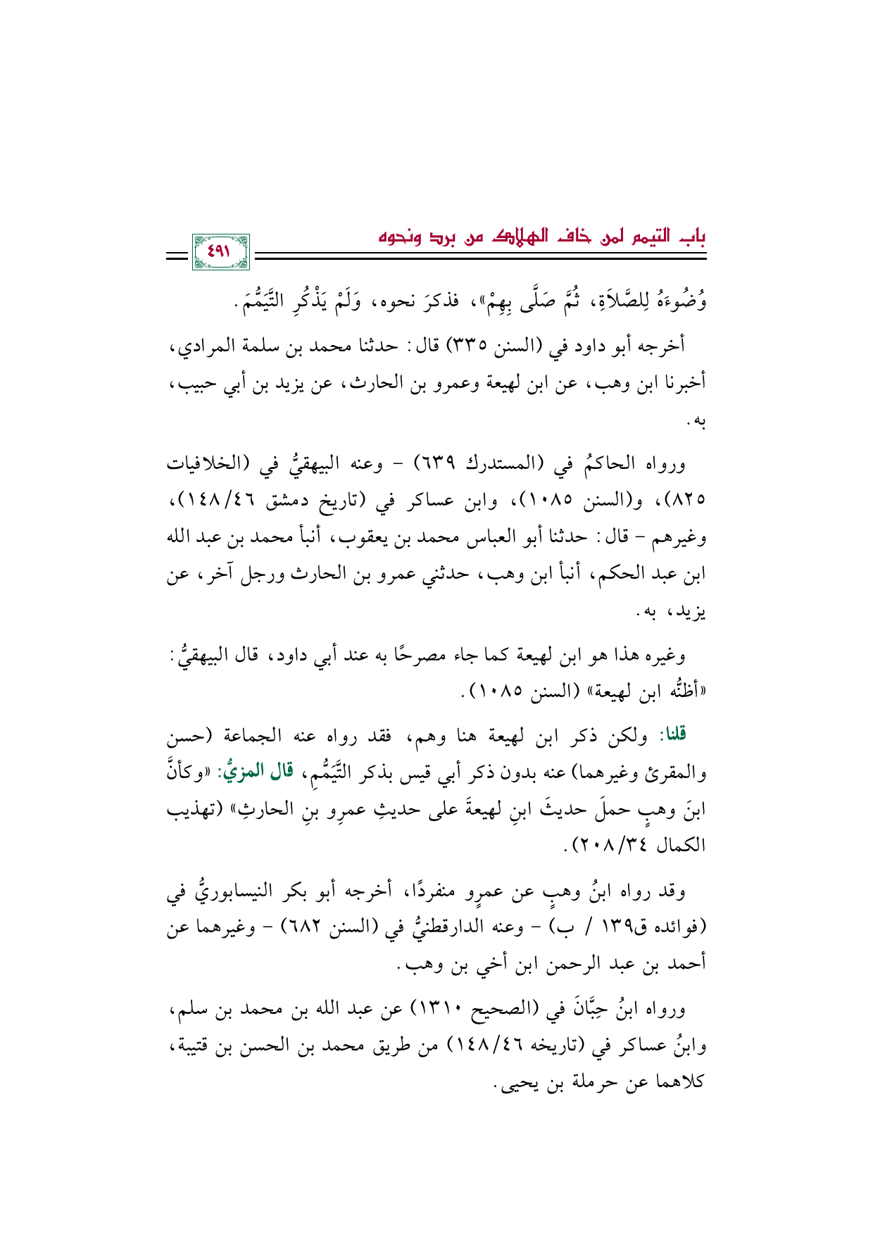قلنا: ولكن ذكر ابن لهيعة هنا وهم، فقد رواه عنه الجماعة (حسن والمقرئ وغيرهما) عنه بدون ذكر أبي قيس بذكر التَّيَمُّمِ، قال المزيُّ: ((وكأنَّ ابنَ وهبٍ حملَ حديثَ ابنِ لهيعةَ على حديثِ عمرِو بنِ الحارثِ" (تهذيب الكمال ٣٤/ ٢٠٨).