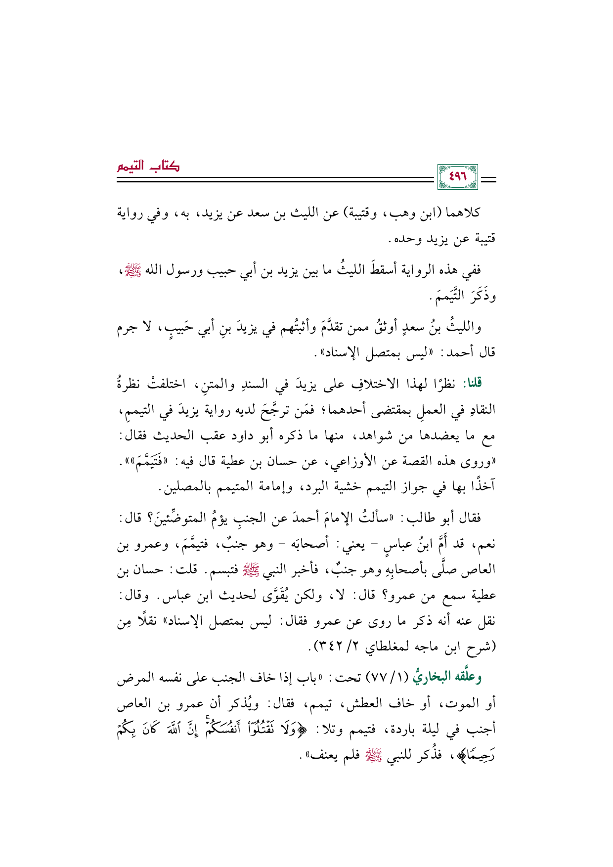 ففي هذه الرواية أسقطَ الليثُ ما بين يزيد بن أبي حبيب ورسول الله صلى الله عليه وسلم، وذَكَرَ التَّيَممَ.