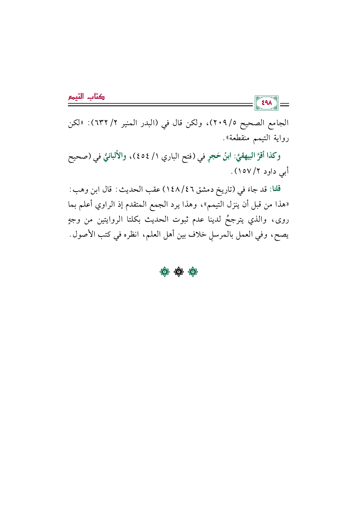 قلنا: قد جاءَ في (تاريخ دمشق ٤٦/ ١٤٨) عقب الحديث: قال ابن وهب: "هذا من قبل أن ينزل التيمم"، وهذا يرد الجمع المتقدم إذ الراوي أعلم بما روى، والذي يترجحُ لدينا عدم ثبوت الحديث بكلتا الروايتين من وجهٍ يصح، وفي العمل بالمرسلِ خلاف بين أهل العلم، انظره في كتب الأصول.