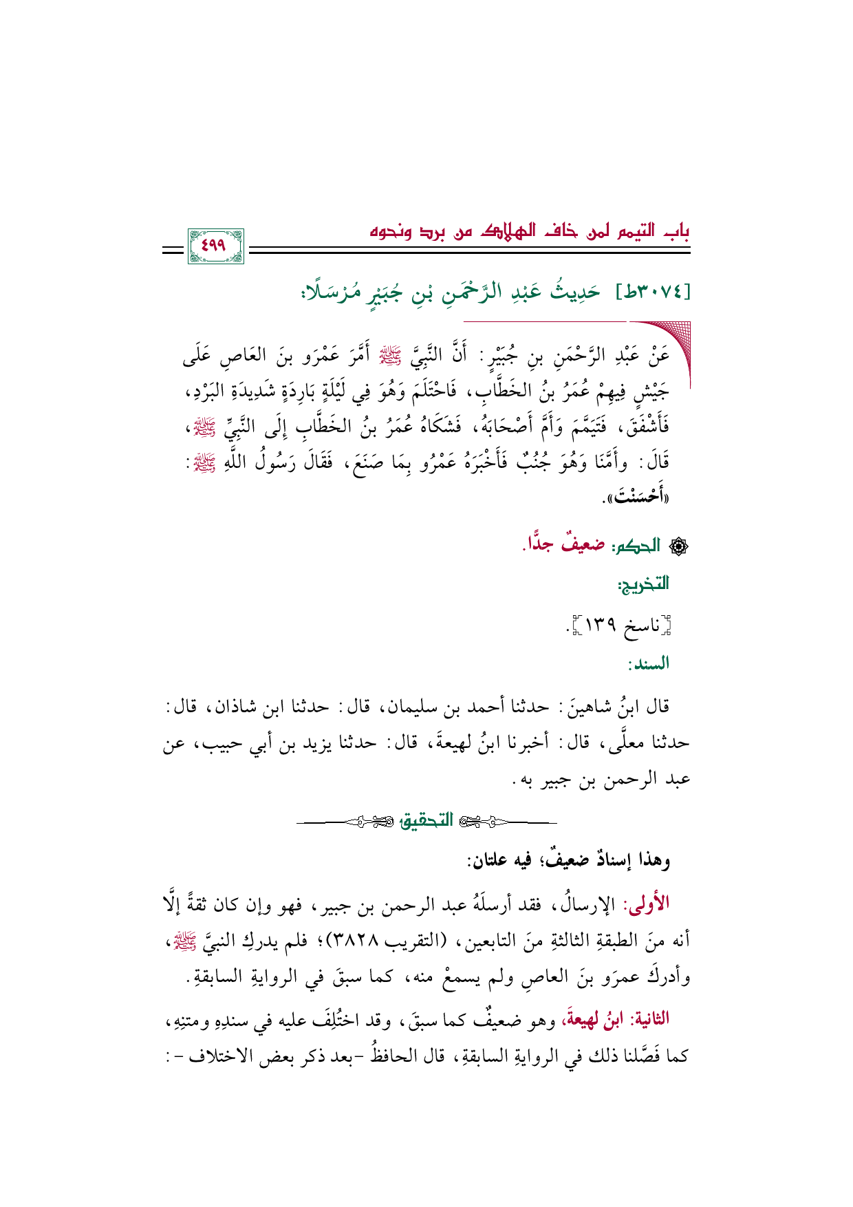 ◼ عَنْ عَبْدِ الرَّحْمَنِ بنِ جُبَيْرٍ: أَنَّ النَّبِيَّ صلى الله عليه وسلم أَمَّرَ عَمْرَو بنَ العَاصِ عَلَى جَيْشٍ فِيهِمْ عُمَرُ بنُ الخَطَّابِ، فَاحْتَلَمَ وَهُوَ فِي لَيْلَةٍ بَارِدَةٍ شَدِيدَةِ البَرْدِ، فَأَشْفَقَ، فَتَيَمَّمَ وَأَمَّ أَصْحَابَهُ، فَشَكَاهُ عُمَرُ بنُ الخَطَّابِ إِلَى النَّبِيِّ صلى الله عليه وسلم، قَالَ: وأَمَّنَا وَهُوَ جُنُبٌ فَأَخْبَرَهُ عَمْرُو بِمَا صَنَعَ، فَقَالَ رَسُولُ اللَّهِ صلى الله عليه وسلم: ((أَحْسَنْتَ)).