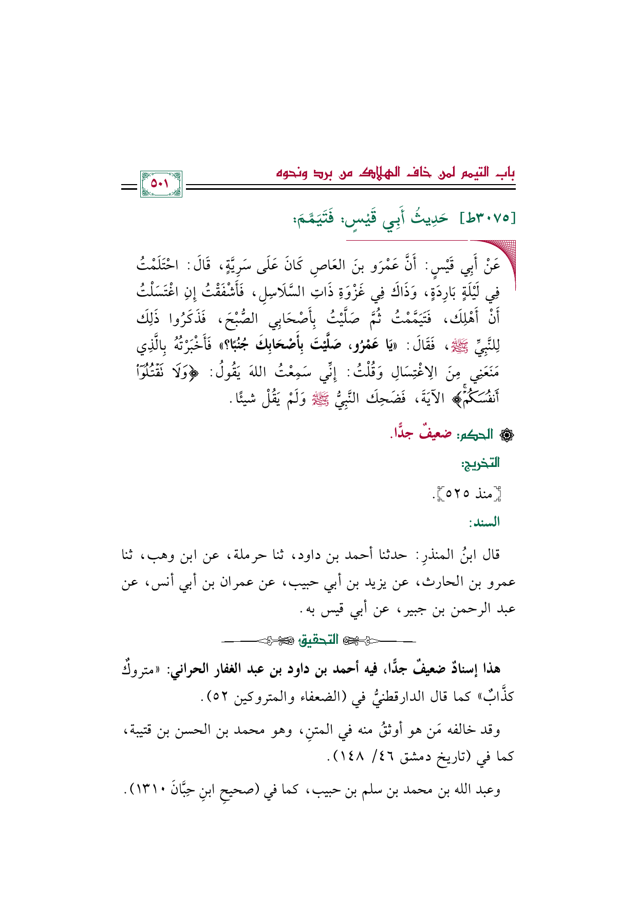 قال ابنُ المنذرِ: حدثنا أحمد بن داود، ثنا حرملة، عن ابن وهب، ثنا عمرو بن الحارث، عن يزيد بن أبي حبيب، عن عمران بن أبي أنس، عن عبد الرحمن بن جبير، عن أبي قيس به.