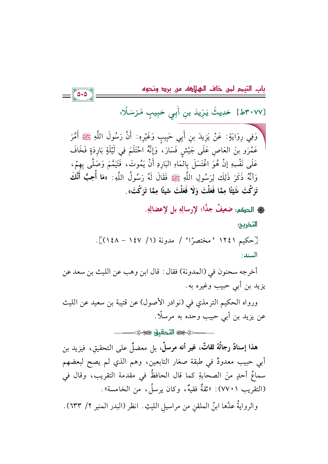 أخرجه سحنون في (المدونة) فقال: قال ابن وهب عن الليث بن سعد عن يزيد بن أبي حبيب وغيره به.