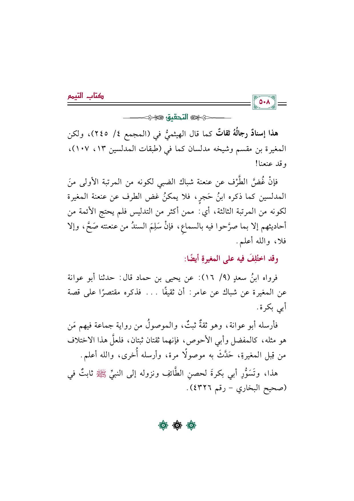 فإنْ غُضَّ الطَّرْف عن عنعنة شباك الضبي لكونه من المرتبة الأولى منَ المدلسين كما ذكره ابنُ حَجرٍ، فلا يمكنُ غض الطرف عن عنعنة المغيرة لكونه من المرتبة الثالثة، أي: ممن أكثر من التدليس فلم يحتج الأئمة من أحاديثهم إلا بما صرَّحوا فيه بالسماعِ، فإنْ سَلِمَ السندُ من عنعنته صَحَّ، وإلا فلا، والله أعلم.