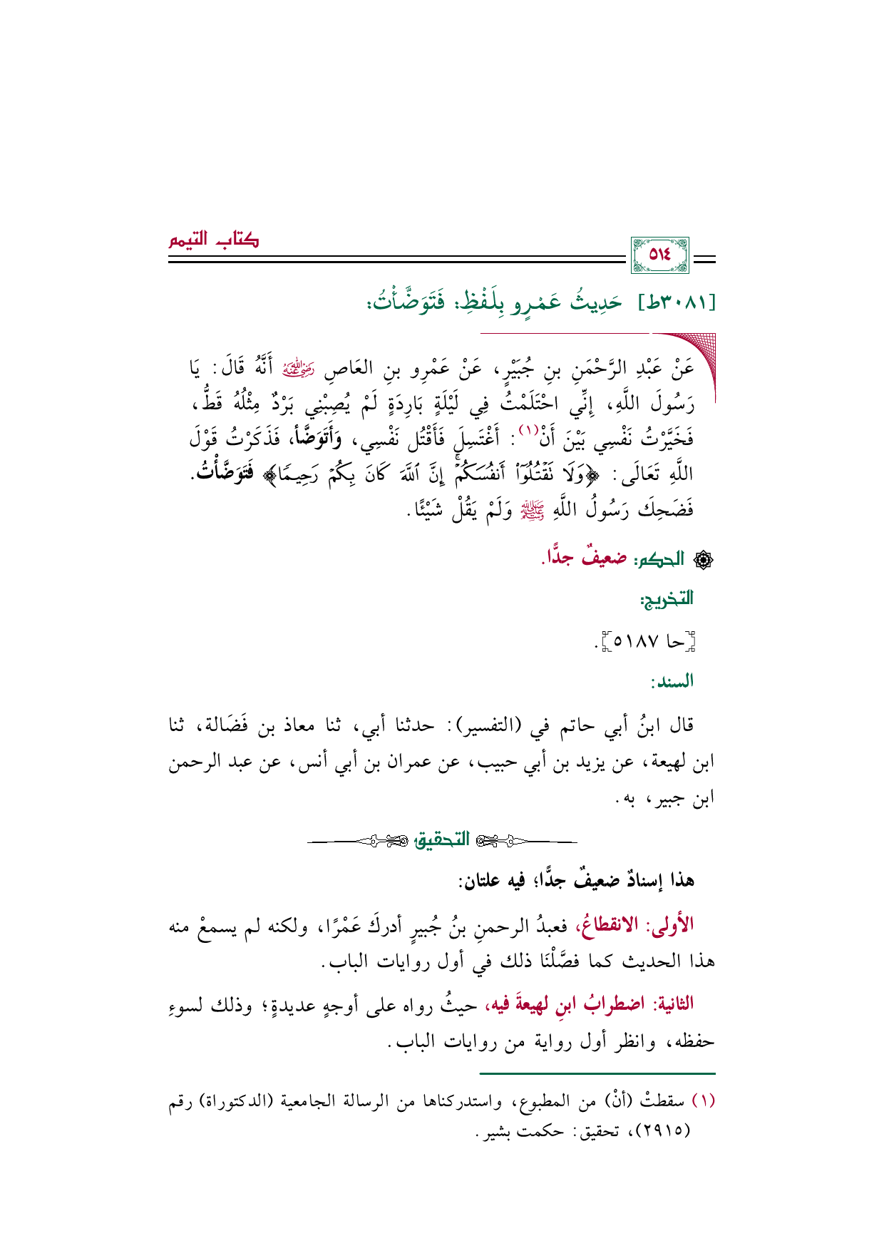 الأولى: الانقطاعُ، فعبدُ الرحمنِ بنُ جُبيرٍ أدركَ عَمْرًا، ولكنه لم يسمعْ منه هذا الحديث كما فصَّلْنَا ذلك في أول روايات الباب.